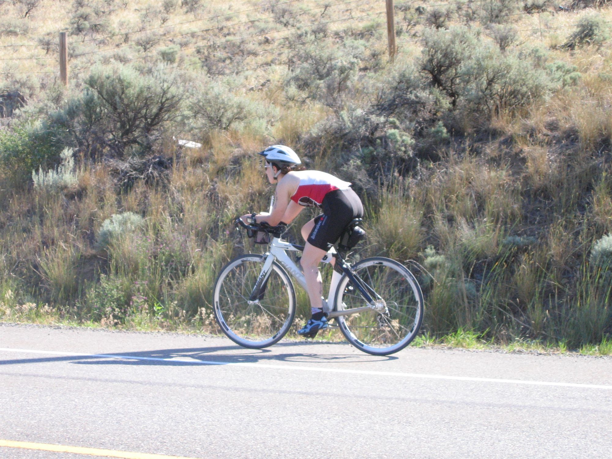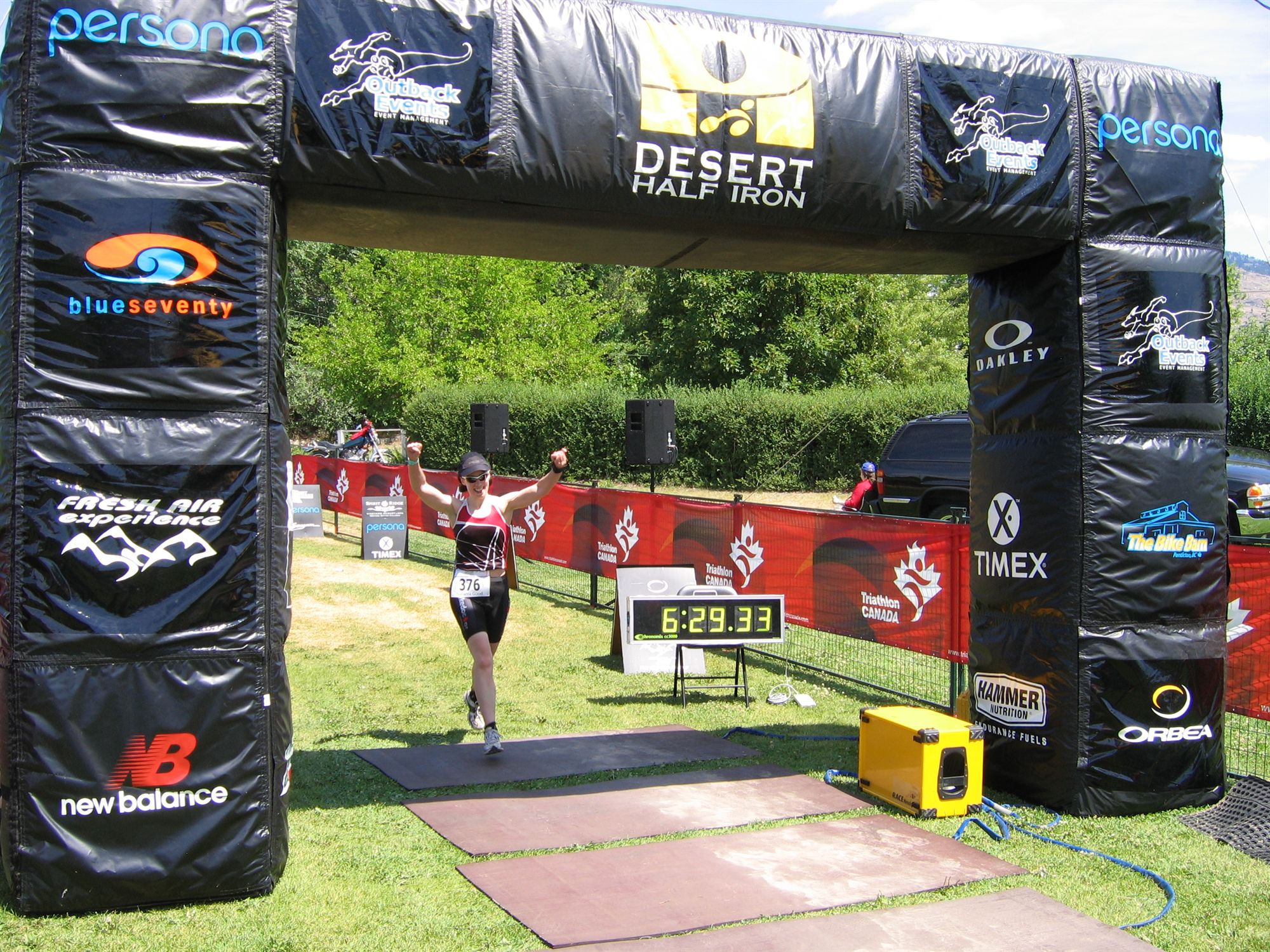 Comments: Rank 63/146 women. Okay, this bike was hard. Really hard, but not impossible. I had a really good time and had to fight the impulse to charge up Richter's Pass at the beginning. I did pass a few people and kept a comfortable pace. I noticed that my road bike would have a been better for a faster cadence because the gear size is different, but my tri bike was lighter. There was a nasty headwind just down from Richter's that really picked up into Cawston, which provided a fantastic tailwind on the way back! The hills were loads of fun going down. People who don't have to bike in the flat prairie all the time don't know how lucky they are. The ride was scenic and more fun than I've had biking in a while. Amusingly enough, I was slogging (and mashing a bit because I'd run out of gears) up this steep incline near the end that I thought was the second last hill, so I was saving energy for the last push. Well, that was the last push! I got to the top of Richter's thinking I had one more hard hill and thought: "That was it?!?!" This provided immense amusement post-race for the gentleman who loaned me his watch. :) I really should have known that that was it because I felt like my butt was going to fall off. The ride down Richter's was great and I tucked and let 'er rip, but I'm too light and one heavier guy passed me. What would you do differently?: Do more that 1 hill workout and more that 2 90+KM workouts before the race.  Transition 2