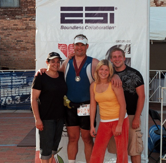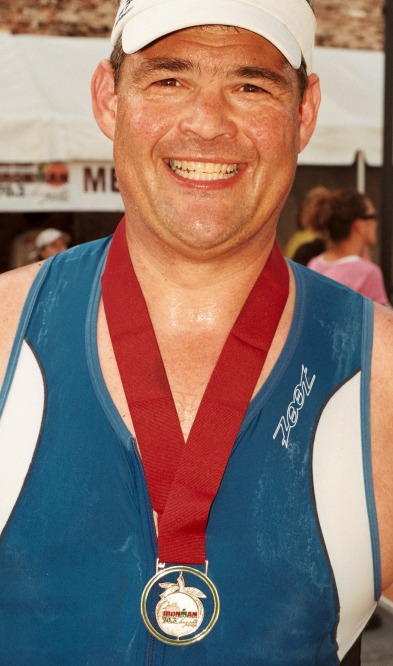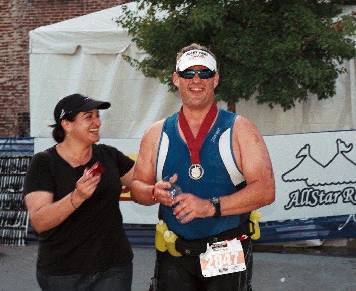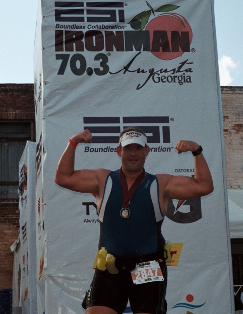 Comments: Didn't take in enough fluids and especially not enough salt/sodium early on during the Bike course. I sweat so much and lost so much salt that my legs were cramping badly. I knew from my training that I sweated a lot and lost a lot of water, that is what limited my long training runs to 8-10 miles, just couldn't carry enough water with me. I figured taking gels and using Heed electrolyte mixture would replenish my sodium and potassium well enough, but apparently not. Had to walk the first 5-6 miles and eventually someone gave me some packets of table salt. I started taking a packet every 10-15 minutes with some Gatorade. Tried running after each dose but would still cramp but able to go a little further each time. Finally after the 3rd or 4th dose of salt I was able to run and not cramp, so was able to run most of the last 7 miles. Took 1 short walk break of about 1/4 a mile and then a couple hundred yards break with about 1/2 mile to go (I wanted to make sure I had energy to run it in and not cramp at the finish line - hey, gotta look good for the Finish Line Photo!) Anyhow, really upset and frustrated with myself for not hydrating correctly and not getting enough sodium back in me, I really expected to do much better on the run. What would you do differently?: Take in more fluids earlier during the event, and start taking salt tablets as well. ![]() Post race