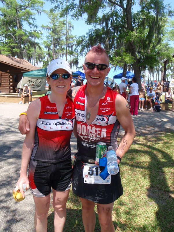 Comments: By the time I started the run it was up in the 90's!! It was hot! Scott was ahead of me and so I was trying to catch up with him. I felt pretty good coming off the bike and found a comfortable pace. About 3 miles into the run I decided that if I caught up to Scott, I would finish the run with him so we could finish a race crossing the finish line together. That's something we have never done and since he was sporting a pink mohawk and a skirt in this race for charity (b/c of me) I thought this would be fun. I caught Scott just before the turn around. My time on my watch said 50 mins. Scott was doing a walk/run combo and so I walked with him for 3 miles (6 to 9). The heat was taking a toll of him at this point and he was getting frustratd. I kept pushing him to rush and finally he told me to just run my own race. So at mile 9 I started running again and finished the race on my own. What would you do differently?: Moving forward I will always run my own race. I thought it would be fun for Scott and I to run together but it ended up being frustrating for both of us. He felt like he was holding me back and I was frustrating b/c he didn't want to try to run more. I still managed a 2:12 (1/2 marathon with 3 miles of a walk/run) so I think I really could have finished this race in under 6hrs. However, I am glad I walked/ran those 3 miles with him. It made me realize that we both love racing but for different reasons. ![]() Post race