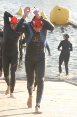 Comments: The swim was terrible. I really thought I was going to do better. Tried to draft a little but no luck so I just settled in and swam my own slow pace. I felt really good in terms of effort and hit the turn-around in 18:30. I looked at my watch and felt great because I thought I could keep the same pace for the return. As soon as I rounded the buoy BAM! there was the sun, just over the horizon and right in my face. I couldn't see anything and this made it hard to navigate. I tried to draft again a couple of times but I was unsuccessful. There must have also been an out-bound current or something because I finished in 44:02. Still, one minute better than '07 so I'll take it but I was expecting something closer to 40. I was happy with how I felt after the swim. Not tired at all and super excited about getting on the bike. What would you do differently?: Everything! ![]() Transition 1