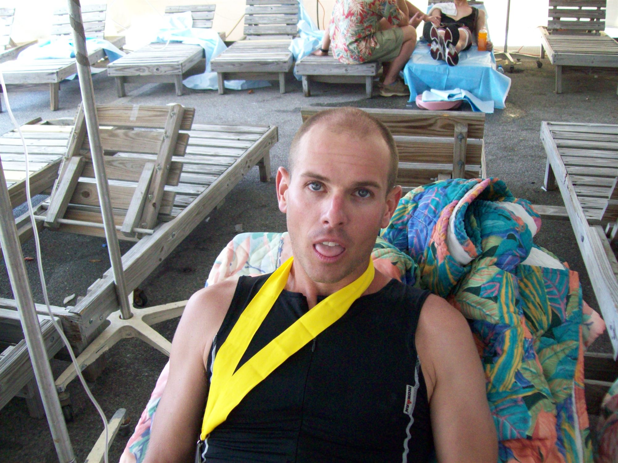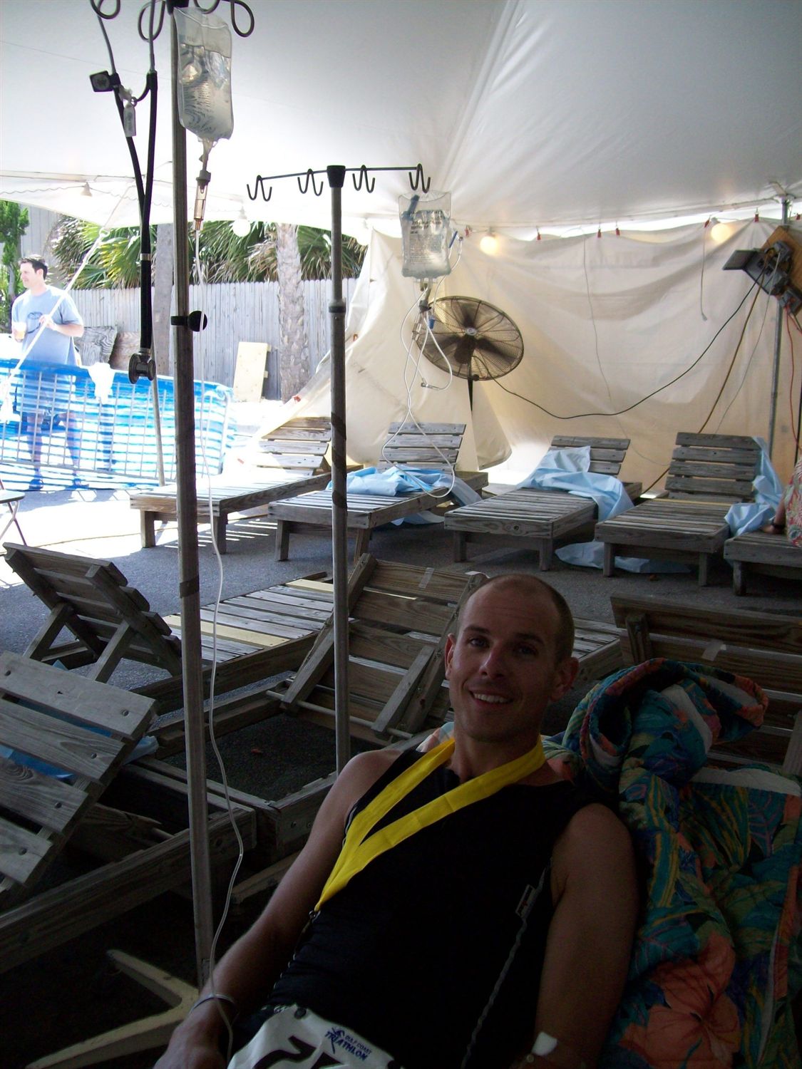 Comments: Let me start by saying I ran a stand alone HM in March in 1:25, so you can imagine my dissappointment. The wheels fell off immediately. My calves started cramping one mile in. I guess I didn't hydrate enough the day before, the morning of and during the bike. Mile one was around 9 minutes. Mile two was around 12 minutes and they only got worse. The cramps worsened, and I couldn't decide what to do. I was pissed, scared and hurting bad. By mile 6 I couldn't even jog anymore. At the mile 11 aid station I actually sat down nd had them call for someone to come and get me. I was dizzy, lightheaded and the cramps were unrelenting. When the golf cart arrived, I felt somewhat better and decided to try and finish. The cramps continued and I walked the last 1.1 mile in 29 minutes. I saw My wife near the finish. She was worried sick as she had seen me around mile 5 and expected me in an hour earlier. We proceeded to the medical tent for 2 bags of IV fluid and a comment by the massage therapist trying to work the still awful cramps out-"you are definetely the most difficult case yet." Man, what a disaster. I am utterly digusted by the results of months of hard work. What would you do differently?: HYDRATE. ![]() Post race
