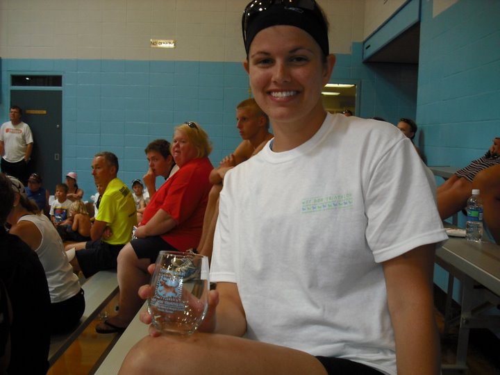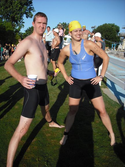 Get up, get dressed, eat my normal breakfast + a banana. Oh wow, I had to use the bathroom A LOT. I don't know if this is something I should be concerned about but I finally had to take 2 immodiums to slow my roll. Jeez. Anyways, got to the race on time but the disorganization was incredible! Stand in one line in this building over here to get the SWAG. Stand in another line to get your number, stand in another line to get your chip, stand in anther line to get marked, then I realize that no one gave me a swim cap, run back over and get a cap. Also at this point I realize I've been given the number 458! YUCK! How in the heck did I get such a high number?? This means I'll be starting waaaaay late. -sigh- Take a deep breath and try to not be overly stressed about the way the day is going down so far. Go cram my bike into a small opening because there were too few racks. Seriously, there was so little room that people just started laying their bikes in the grass. The race started 20-25 minutes late. Then I was way in the back so I got to wait around for a while longer. Race start was supposed to be 7, I actually hit the water around 8.