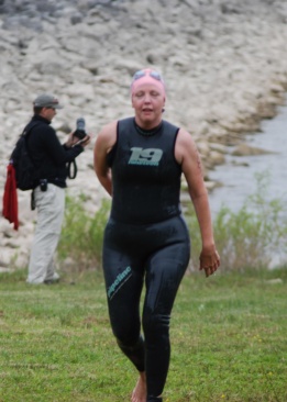 My swim was brutal. I didn't try my wetsuit on beforehand and didn't take the time to put it on comfortably - it felt incredibly tight. I took off at the horn and the neck felt like it was choking me. The knees were bunched uncomfortably. I rolled onto my back and kicked while trying to stretch out the neck but it was no good. Resumed front crawl. The water had no visibility and everyone passed me. I couldn't get into a good rhythm. Contemplated undoing the wetsuit a bit but wasn't sure of the outcome of that. In the end I did the backstroke for almost the whole course but didn't sight enough and wasted time and energy zig-zagging back and forth. When I rounded the first buoy I got half way across and started feeling people swimming around me. Noticed I was in the middle of the path for the next wave which had caught up to me. Just kept a straight course doing front crawl until I rounded second buoy. Then rolled onto my back and back stroked to the finish - again going off track a couple of times. It felt like the longest 1000m of my life but given all the wasted zig-zagging I'll bet it was even longer than 1K.