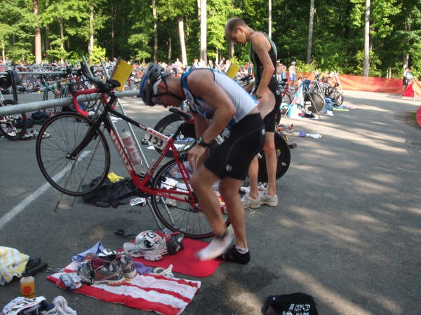 Comments: Felt really good but it took me awhile to slow down my breathing from the torturous swim. I was passing alot of guys from wave 1 and 2 and also some of those mean ladies who passed me in the river and wouldn't slow down so I could draft. I passed my new friend Jonah (I didn't know she was such a good swimmer) and wished her well. When I encountered the first hill I thought it was the big one and slowed up too much. The real hill was tough but I got through it. From that point on until the end there was a group of us that kept passing each other and getting passed by each other. That help motivate me to keep pushing. What would you do differently?: More hill work before race. ![]() Transition 2