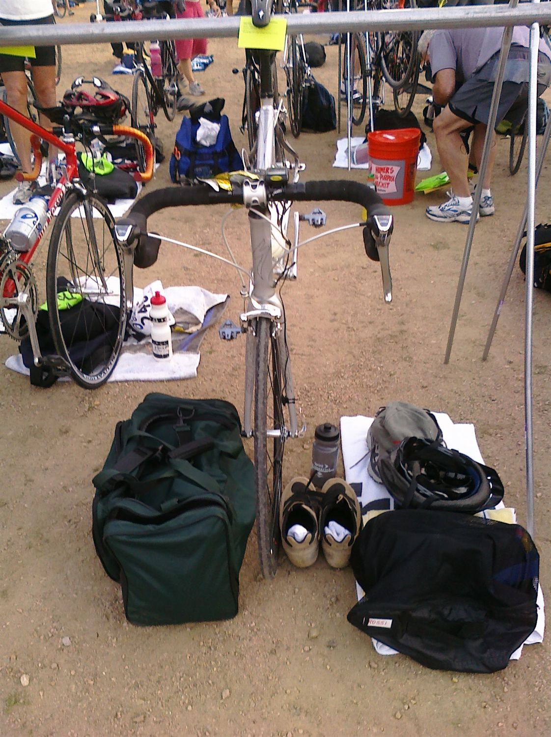 Comments: My first thought was: where are all the bikes? I guess that's one advantage to being BOP in the swim. When your bike is the only one on the rack it's a cinch to find! Anyway, I thought T1 was going great. I had my wetsuit half off and my swimcap and goggles off by the time I reached my stuff I struggled a little getting the wetsuit around my ankles (especially the left one) but on with the helmet glasses and bike socks and shoes and carried the bike out. As I got to the exit, I saw the electronic loop in the ground and looked down at my left ankle, no timing chip! OH S*&^T!! I guess its lucky I looked down at that moment. But the flood of thoughts right then included: "I lost it in the water somewhere," "I gonna have to pay 95 bucks", " I wont know any of my splits" then I got a little calmer and realized I should check inside my wetsuit. So I started back to my area (with my bike) My brother (who was standing just outside the fence and is smarter than me said "leave your bike here"--Great idea. I ran back and my chip was laying on the ground right under my wetsuit--WHEW. So I put it on my left ankle, ran back to my bike and off I went. What would you do differently?: Watch that @#%^! timing chip!! ![]() Bike