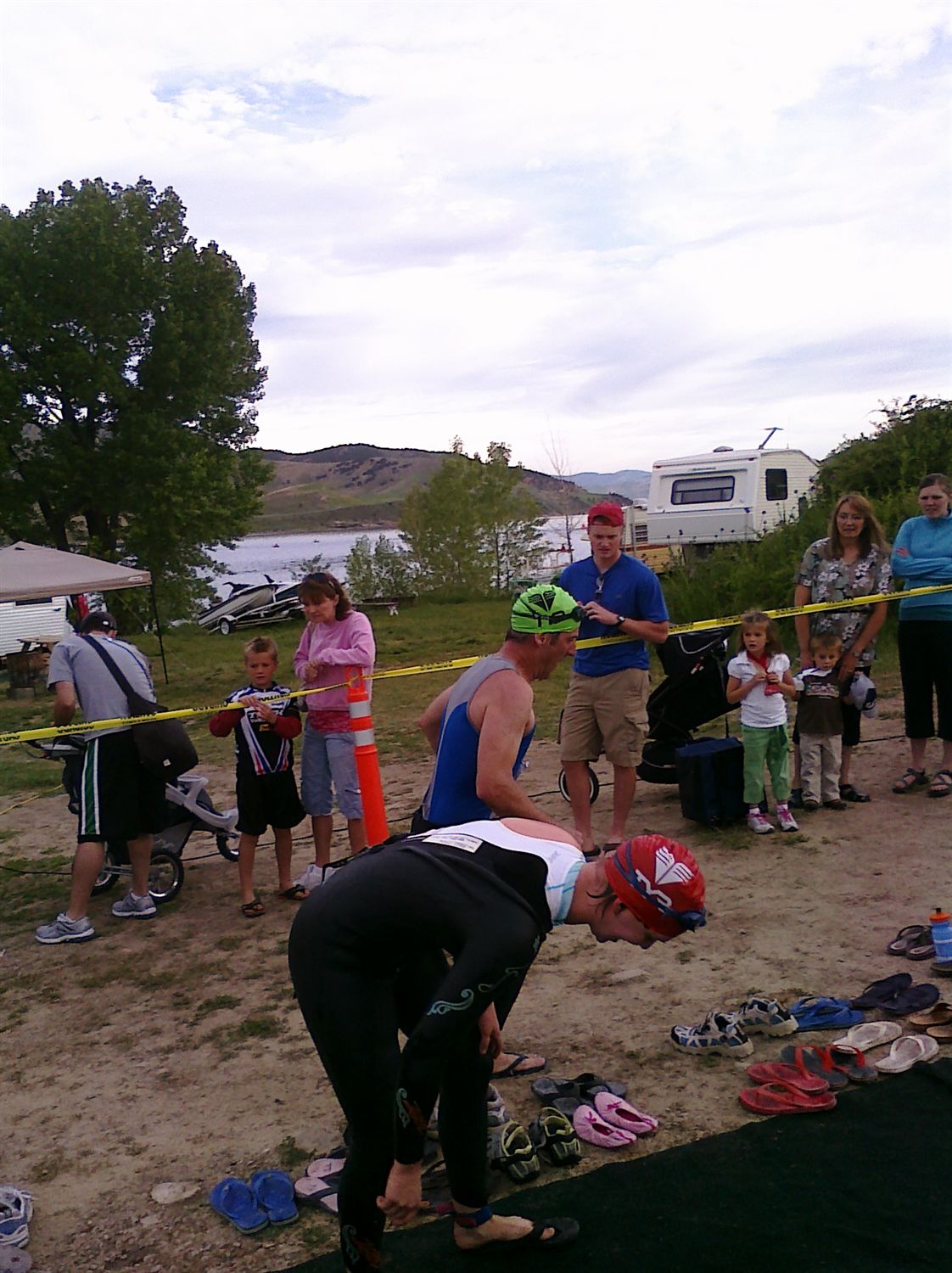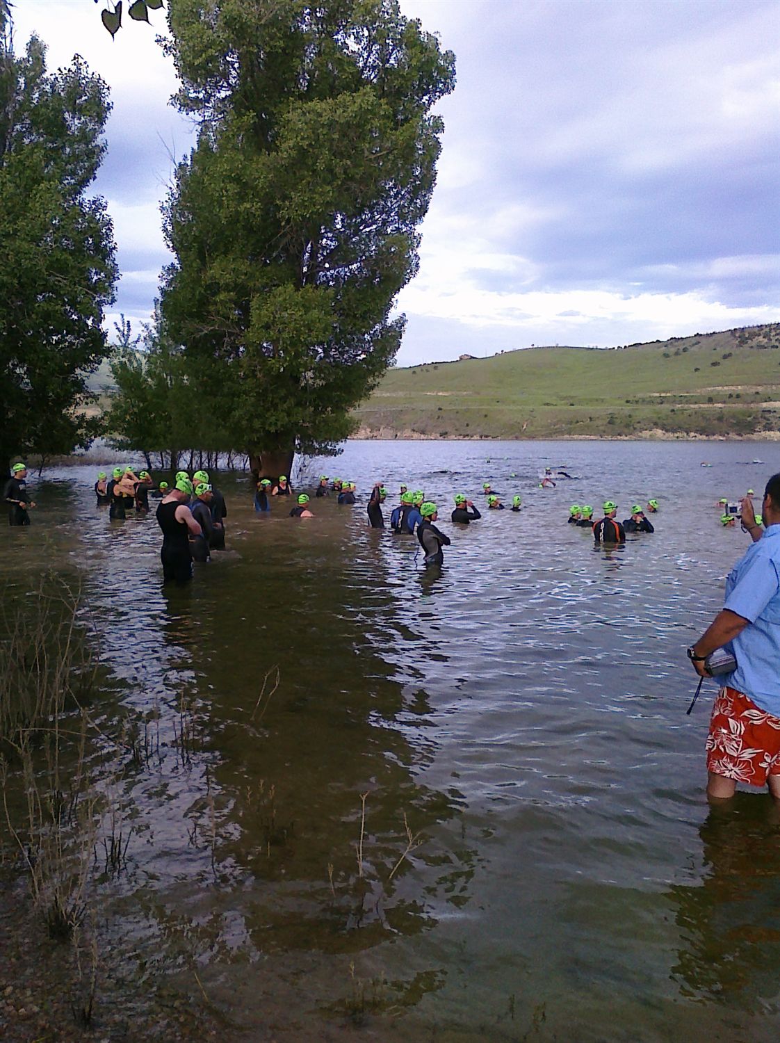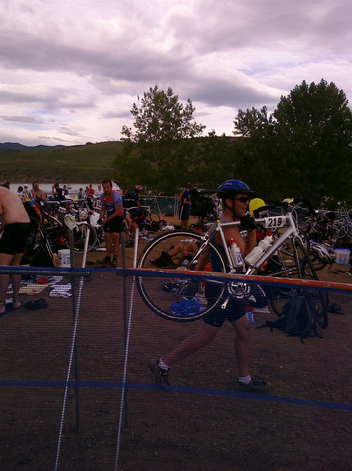 Since this was my first triathlon, I can't really call it a routine. But, the previous night, I got all of my gear ready and mentally went over the race in my head. I tried to go to bed early. Why? Well, I guess so I could lay awake longer. I tossed and turned alot but I know I slept some because of the tri-mares I had. I woke up at 4:30, drank some water, ate whole wheat toast with peanut butter and a bannana. I drank a cup of tea on the way to the race. I arrived early enough to get a decent parking space and I set up my transistion area with plenty of time to spare. I went to get body marked and scope out the port-a-johns.(just a quirky observation, but haven't port-a-johns come a long way in the last ten years or so?) I think at this poit my nerves had calmed a bit and I was enjoying observing the other racers come in and set up. I knew I didnt want to put on my wetsuit too soon, because I had practiced with it a few days earlier and I got very hot very fast. I saw some swimmers in the reservoir at this point warming up. I thought "I should go do that, too." That thought, unfortunately, never tranformed into action. I ate the corner of a clif bar, drank a little gatorade than went to the start.