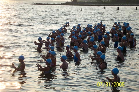 Course: Out and back following posts in Lake turn around one buoy and back to shore. Liked the "in water start" as we did not have to do our best Baywatch impression running through knee deep water to start the swim. Serioulsy love that foghorn they use for the start. Gotta get one of those to motivate my fellow employees.