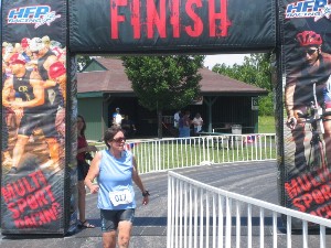 Comments: Took off with my slow shuffle/run out of T2 and felt good. I was several minutes into the run before I noticed I still had my biking gloves on. Oops. Took them off and stuffed them into my pocket. Walked up a steep hill to the gravel reservoir path and enjoyed the sunshine and views of the water. Saw lots of big fish jumping. Good thing I didn't see them when I was swimming! I love to run. Its my favorite event right now. Even though I'm slow, I just really enjoy being out. I smiled lots on the run because even though the rest of the day was tough, I'm in the last segment and I'm doing what I love to do. I saw lots of people heading in from the out and back and most of them gave me encouragement and I did the same to them. Saw Amy. Smiling and happy, of course! The girl I passed on the bike passed me back on the run. She hit the turnaround and we smacked hands as we passed, then she was gone and I was the sole remaining runner on the course. Grabbed a quick cup of heed at the turn around and headed back in. There was one other water stop and I thanked the volunteers for waiting for me. About this time, I see Amy and Andy heading my way. Amy is hollering and smiling and tells me that she came to run back with me because it gets lonely out there, you know? LOL! She chattered and chattered and told me that this was the best birthday ever and how much fun she was having. The last 1.5 miles I ran with her were 1 minute faster per mile, so I negative split the run. :) We rounded the corner and I heard the announcer tell everyone to gather around the line to welcome in the final finisher. It felt so good to finish. Even if I was DFL. Andy got a great pic of me crossing the line. Several people came up to me and congratulated me. One who was working communications on the course made a point of telling me he was glad to see I had finished. In all honesty, I would have been more bummed to be last if it wasn't for Amy's contageous enthusiasm. What would you do differently?: Nothing. I had a great run. ![]() Post race