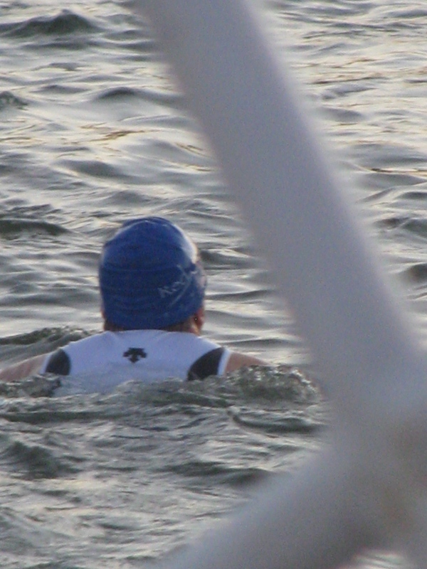 Comments: Seeing the course map on a piece of paper and seeing it person are two very different things. I was standing at the edge of the lake and looking for the '1st green bouy' that was the sprinter's turn point. It looked really, really far away. With only 4 minutes between waves, we had to get into the water right after the 1st wave went out. The starting point was quite a way from the lake entry point, so we all had to swim out to the starting line. I wasn't swimming out there really hard, so I didn't really make it all the way to the starting line before the horn sounded. Before we got in the water, somebody at the stairs asked about the swim path and one of the 'officials' said to go through the bouys. I'm not sure why I listened to that, but I started to head between bouys at the first one and had to be guided back outside. Fortunately, I was going to skim the bouy either way, so it wasn't much of a course deviation. I kept chugging along, doing mostly freestyle, but unfortunately, breathing on my right with every stroke. I told myself I wouldn't hang on to a kayak, but maybe the 2nd green bouy. I got to the 1st green bouy and rounded it in a mess of people, starting to see the women's wave behind me catching me...dang! I got to the 2nd green bouy which was the point to head back and held on to the bouy for maybe 5 seconds and then was back off. I did a little resting on my back a few times, but mostly kept moving, not sure why I was swimming so slowly, but I just keep ignoring my kick. Before the race I was thinking that maybe I could squeeze out an Oly distance, but that would have been disasterous! I kept chugging away and actually caught up to a few people in black swim caps that were the first wave, however, more and more red caps were showing up around me. Going under the bridge was a relief since I could actually tell I was making ground as I passed underneath. I got to the last bouy and started heading back to the stairs. It seemed like forever from the last bouy back to the stairs, but I made and got out of the lake with a little help. wow, that was a long swim! I started trudging to transition and saw my brother and my wife and kids, so I picked up it a little. What would you do differently?: Learn to really swim. That says it all. 3.4 min/100 is dismal. Learn to swim. At least I don't lose my head. My wife said that there were a few people that had to be pulled out of the water before they even got to the first bridge.  Transition 1