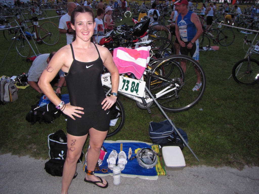 The very first thing I did was find my bike rack. Since I went to Mack Cycle to pick up my packet the first day they were available, I was in the very first row (I had bib #80). I plan to do the same thing next time. Being right on the concrete path was awesome. I semi-set up my transition area just to secure my spot. I had to go find some BUG SPRAY (nobody warned me about the FLESH EATING CREATURES that lurk in the grass in the wee hours of the morning). I have bug bites ALL OVER... and I do mean ALL OVER. LOL.... I also had to find some way to secure my bike number to my bike, as the adhesive was on the WRONG SIDE of the number!!!! Did anyone else have this problem??!?!?!? They ended up stapling it for me. I got body marked, picked up my chip, then went to the transition area to finish setting up my stuff. I went through the transitions in my head and knew I was ready. I went down to the beach to sit and talk with my husband before the race started. Went to the bathroom about a bazillion times... then it was finally time to head to the start. When I saw how far the distance was from the swim exit back to transition.... I started freaking out a little bit. But what can you do at that point but just buckle down and get through it??? I watched all the waves before me go out, and then it was my turn...... Females 39 and under... pink caps!