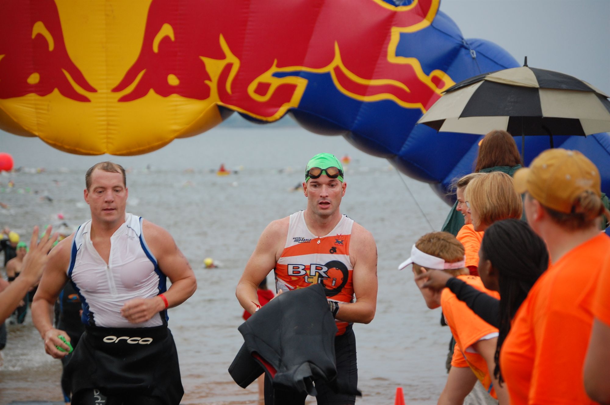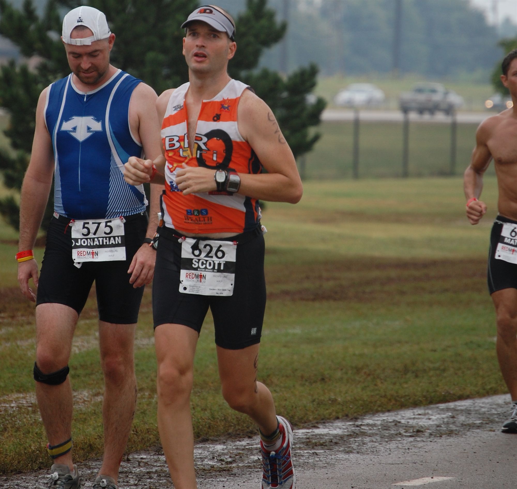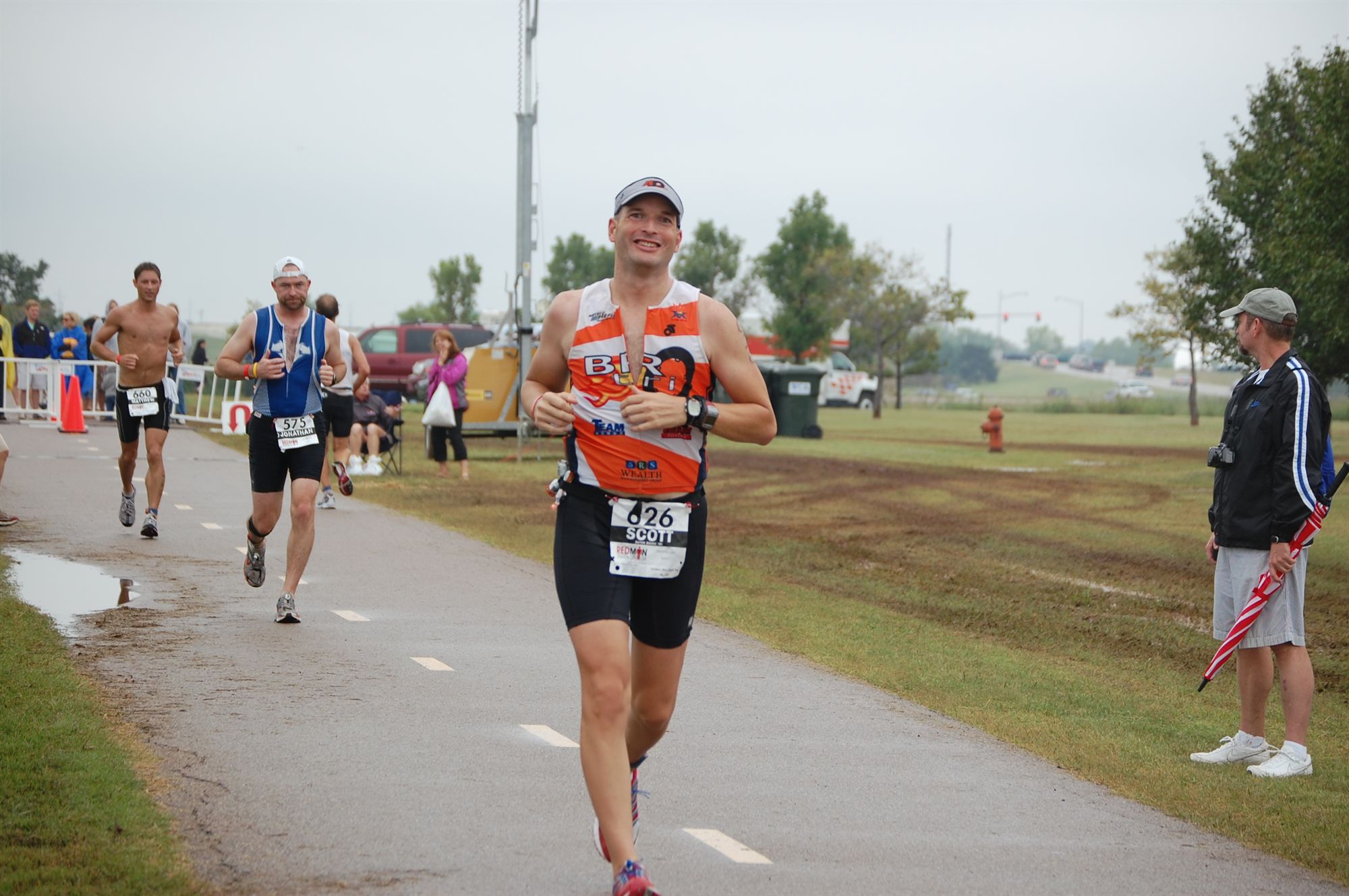 Comments: The run. The run course was two loops. There were several places on the loop that was under water. We were running on a multiuse path around the lake. It was still raining off and on which on the run is great. Our feet stayed wet the whole time but I didn’t get any blisters so no harm no foul. I felt great on the run. I kept my heart rate about 7 bpm under my target hr to be conservative on the first lap. I was tired but mentally I felt really good. I took a gel every two miles on the run like I had planned. The first loop zoomed by and I ran it in a 56 something. About half way through the first lap I needed to pee again. I guess since I rely on liquid nutrition on the bike and it never got hot, I never sweated out any of the fluid I was taking in. At the turn around I saw Jennifer and I busted into the biggest grin. I felt really good but I knew that could go away quickly. At the beginning of the second loop I found a port a john and stopped and waited for what seemed like forever and no one ever came out. I finally just started running again. I found one two miles later and took care of business. So two stops on the second loop. At mile 7, I remember thinking that I had only 5 miles left to run. Then at mile 8, I thought that I only have 5 miles left. Wow, my math skills while tired stink. My hamstrings started feeling like they were going to cramp. They never cramped just that twinge feeling you can get. I started drinking some Gatorade at the opposite aid stations from my gels which I was washing down with water. I tried to encourage everyone I passed. I got accused of being a good liar several times when I would tell them that they were looking good. I actually picked up the pace to go down the finish chute but slowed down for the guy in front of me at the end to not mess up his finish picture. I finished the second loop in 1:01 something. So the run total was 1:58. That is a 25 minute pr from New Orleans. I really couldn’t believe how good I felt. I was tired but I felt great. I walked long enough through each aid station to get my liquid down and didn’t walk at any other time. That was my main goal coming in. ![]() Post race