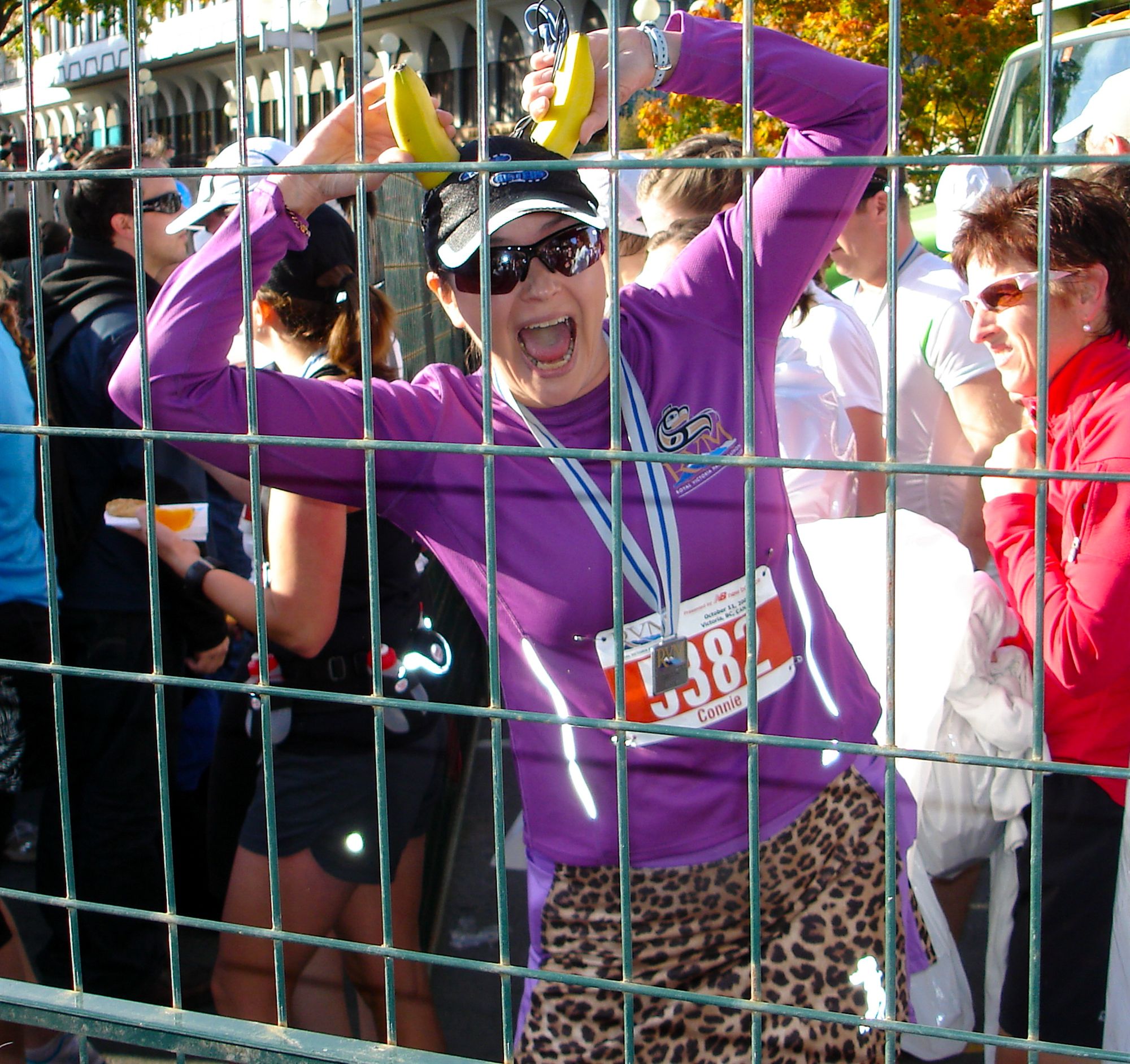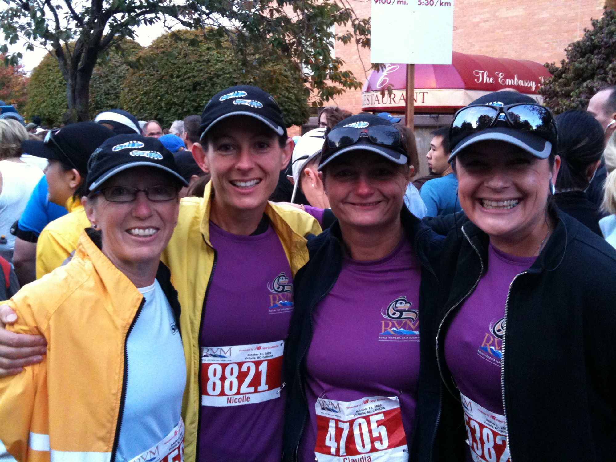 Shared some early morning photo ops with fellow team mates from the Mount St. Marythoners team before lightly jogging to the start of the 8 km race, in which my husband and friend were running. Watched them take off, then walked to the 2:00 sign for the Half, where I met my training buddies. Downed my GU Chomps and a S!Cap.