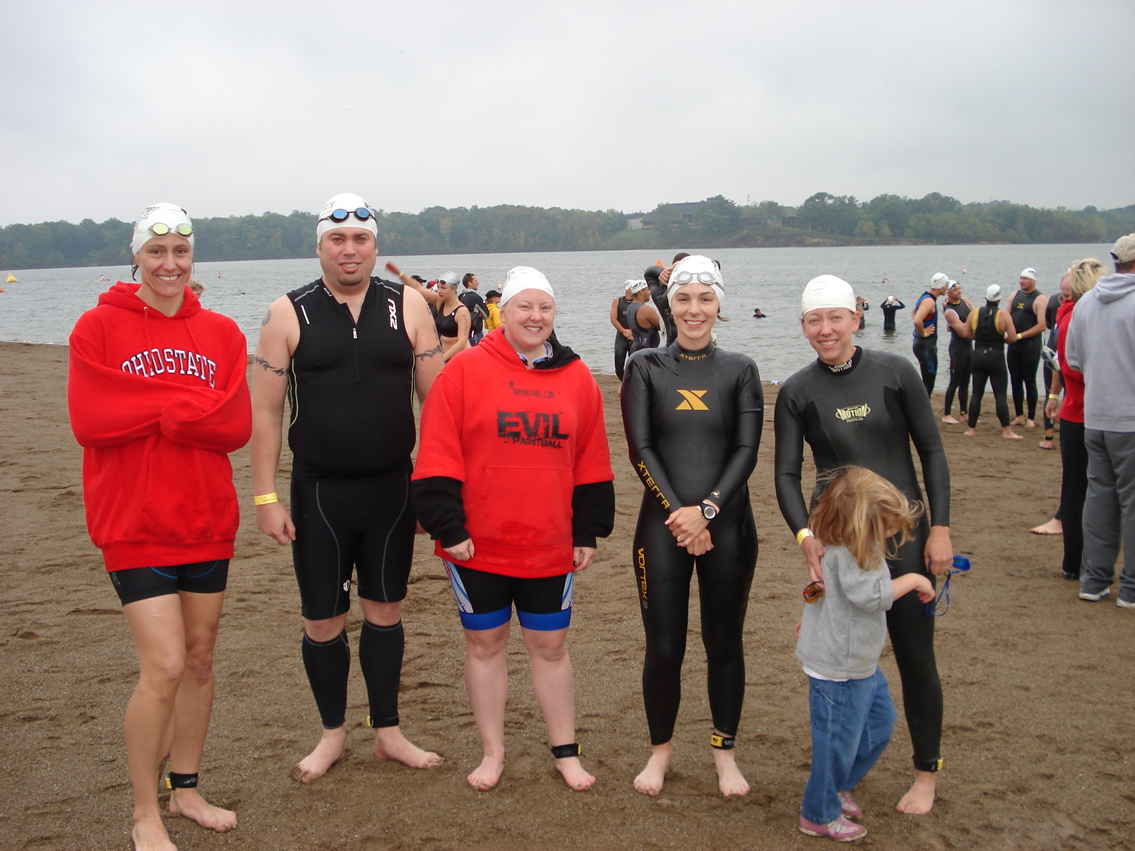 Some stretching, got in the water. Water was warmer than the air! Got to spend some time talking with other BTers before the race. It's hard to find your friends when everyone is almost a foot taller than you....and everyone is in white swim caps and black wetsuits. Srsly if I ever get a wet suit it's gonna be bright fucking orange.