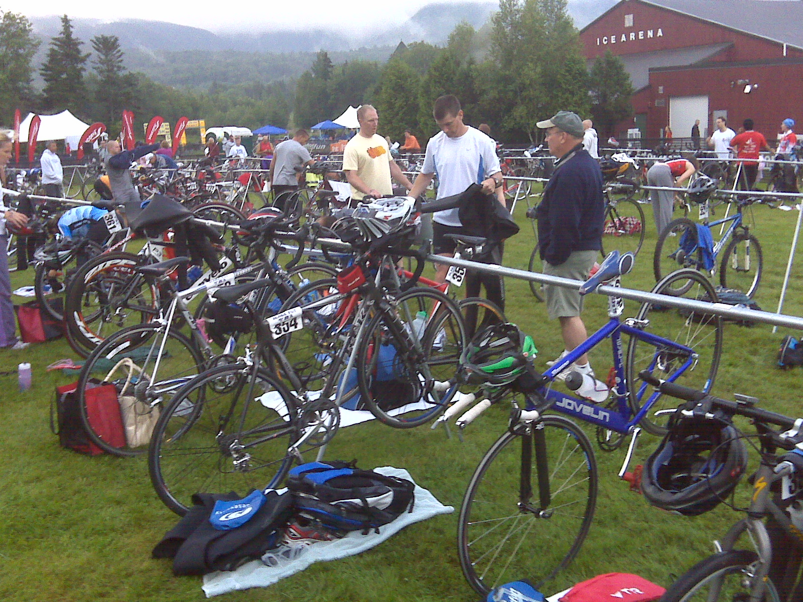 Woke up at 440 am before my alarm. We had come into town the day before so we were within walking distance. Had a peanut butter sandwich, got organized, kissed my wife and son and headed out to transition. It had rained the night before and everything was foggy that morning with the exception of one patch of blue where you could still see the moon.