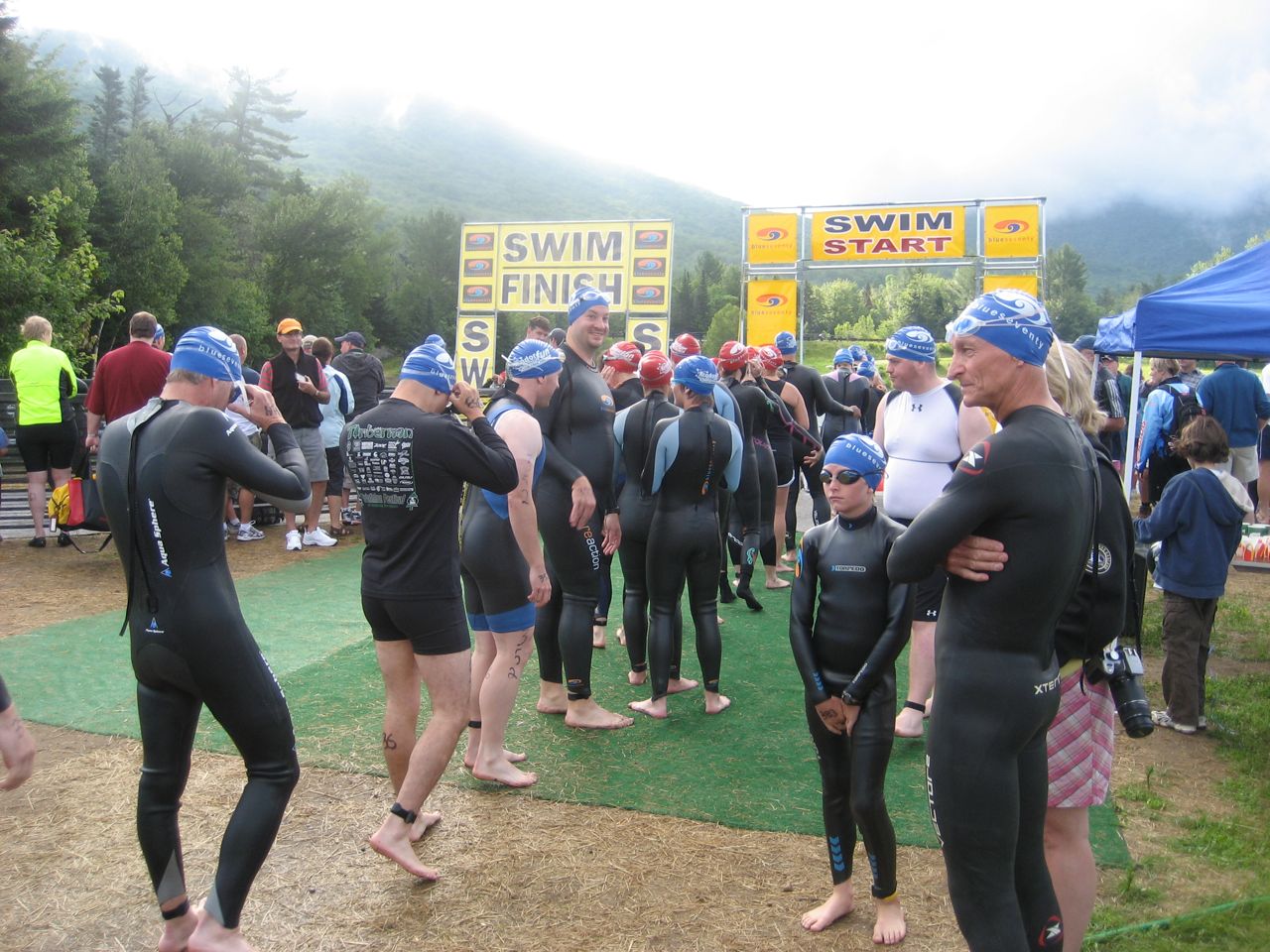 Got set up, had an orange and a zone bar, chatted with my new neighbors and met some great BTers. Squeezed into my wetsuit and headed down to the swim start with a friend of mine who was doing the race too. Hopped in for a few minutes to paddle around and then had to climb out for the start.