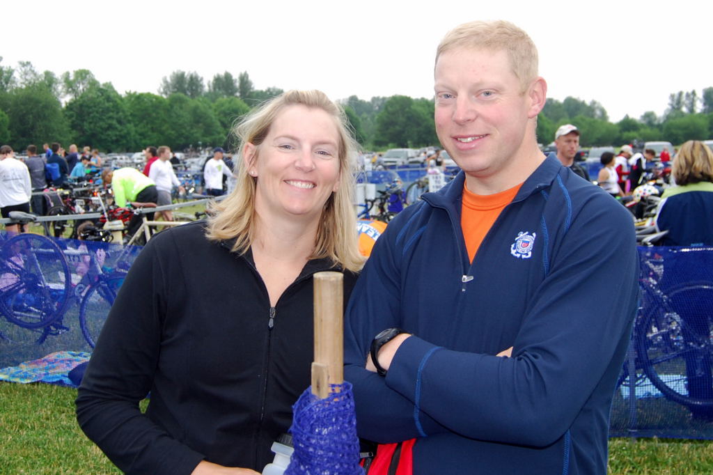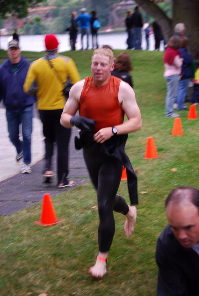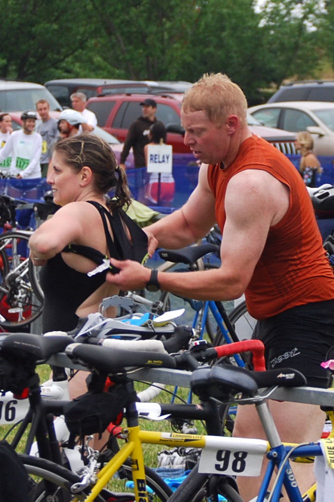 Comments: Started passing riders right off the start. Felt good to be on the bike. I wondered if I was going way too fast to start out, but decided that 12 miles wasn't that far I could just go for it. My goal was to average 18 mph. I have about 80 miles pre-training on the bike, that's it! Went back and forth with several riders. Since this was my first race, I was worried about the drafting rules and tried to stay out of a draft, but yet didn't want to lose ground after a rider passed me. Hit the turn around and felt great. A few minutes later I caught sight of my sister. She looked good. She later said that I looked like I was smoking! Into the dismount and I saw my mom cheering me on. Sweet ride. What would you do differently?: Drink more gatorade. My seat height was a bit too low, I need aero bars. ![]() Transition 2