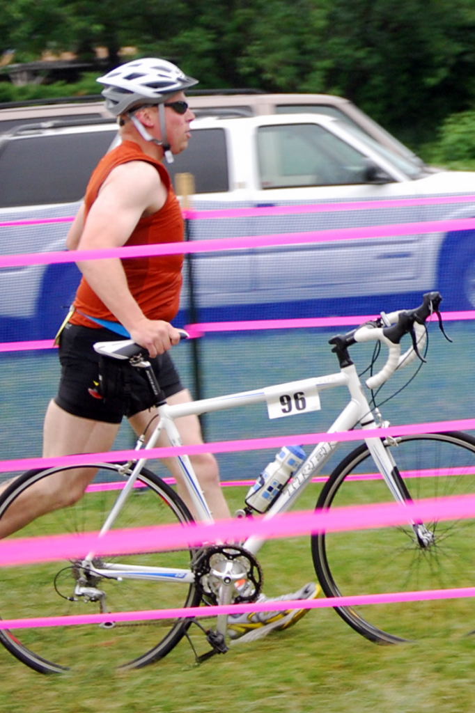 Comments: Long run up a hill and into transition area. I tried to drink some water at the aid station, but it wouldn't go down so I just washed out my mouth. Into transition, getting my shoes on, the lady next to me asks for help getting her shirt untangled from her race belt. I take a moment and help her unravel her top. Remembered to put my helmet on and buckle the strap before unracking the bike (my biggest fear was to forget this). Then off running to the bike mount area. What would you do differently?: Put helmet on while stripping off wet suit? Never heard of this, but it makes sense. Need to practice. ![]() Bike
