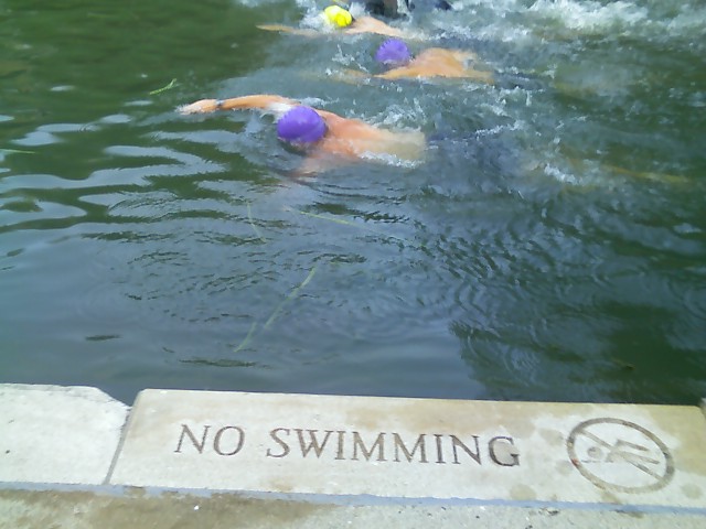 Jogged around the transition area, and did some stretching. Swam about 2mins to warm up before my wave took off. Almost missed my wave though cause I was the last number to go in my wave.