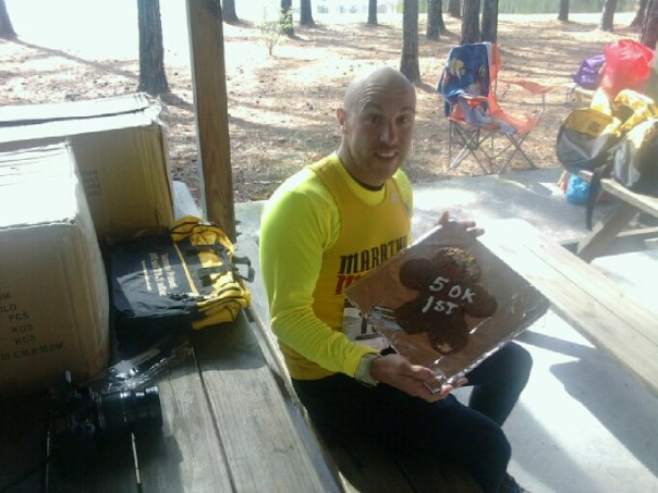 Comments: Lap 1: I barely made it to the start line after getting everything set before the gun went off. I started my Garmin and took off with the lead people. I immediately took the lead but upon making a wrong turn about 100 yards from the start line, I decided to stay back and run with others so I didn't get lost. This was almost an entirely new course for me, so I figured it'd be better to run the whole first loop with the lead group, get to know the new course, and then take the lead in lap 2. At Mile 1 I realized we'd been running uphill the whole time. This new course was a little bit tougher, terrainwise, than the previous one was. During Mile 2, there was a lot of grass, which was cut but was covering up large holes in the trail. I managed to put my foot down into one of them and felt the pain in my Achilles. Mile 2 and I'm already hurtin' myself! Mile 3 included the "big hill" from previous years, but we only went about 75% of the way up it before we took a hard right and made a small loop onto a fire road that would take us up another long steep incline that met up with the top of the "big hill". I was now running with only 2 other runners...a really young kid in his 20's and an older guy who seemed to be struggling to keep this pace. I was comfortable, but I could see that "the kid" was not even winded. Uh oh. Miles 4 and 5 were pretty much downhill and just slightly uphill at times. The last .75 miles of the course was the same as last year's course so I knew where the hills were and what the terrain was like. There was some gravel from about .4 miles before the start/finish, to about 100 feet before we entered the pavillion area. I ran in with "the kid" and the older guy. The older guy dropped here to (I assumed) take off extra layers and "the kid" went to the bathroom. I stopped to get a drink and a gel. First lap, 37 minutes. Lap 2: I left after grabbing some water and Gatorade. I was still in the lead. As I ran up the first hill, I noticed "the kid" coming up fast. By a half mile in, he'd caught up to me and ran with me. We chatted a bit about ultras. He'd NEVER DONE ONE BEFORE!!! Wow, I thought...this kid's crazy fast, he's gonna beat me unless I can run him out. About a mile and a half in, he tripped and fell in almost the same place I stepped in the hole last lap. He got up though, and jetted by me. That'd be the last time I'd see him. I took a gel about 2 miles in to the second lap. The rest of Lap 2 was pretty much like the previous. I came in to the start/finish area at 1:14, almost exactly the same time split as Lap 1. Brian told me that I was 3 minutes behind at the start of the next lap. Lap 3: Still pretty comfortable. I was still counting on the kid running himself out so I didn't want to push it too hard. I was still running at sub 8 pace...mostly sub 730 pace...so I figured, any faster and I'll be the one bonking. I took a gel and then stopped at the unmanned aid station on the course this lap. I hadn't stopped at this station in the first two. I started lapping people on this lap. A mostly uneventful lap, I was halfway done at the start/finish line crossing this time. I made sure to eat and drink a little more this time. I started drinking my cola and chicken broth since now I was halfway done. Brian gave me another gel and I headed off. I was now 7 minutes behind the leader. Lap 4: I still felt really good after 15 miles, but I knew my critical point was still over 1 lap away. So I was cautious. I was keeping up a good pace, my music was really helping me stay focused on the task at hand and not what "might" happen. All in all, I was having a good day so I was enjoying it. It was starting to get warmer now, so I kept that in mind. I took my gel after the first hill ascent, and I stopped for water at the unmanned aid station, the two hills really started becoming a challenge. I started to notice that the second hill got steeper as I went up, and then leveled out at the top. It was definitely tougher than the "big hill". After that hill though, the rest of the coure is flat or downhill (except for a few little inclines in the last half mile) so I felt good. I came in to the start/finish area and Brian handed me a gel and some water. I stopped and drank my cola and broth again, which now, tasted better than ever! I even went up to the aid station and got some extra food from the table. I was now about 20 minutes behind, so it wasn't worth going crazy to get out of the start/finish area. I had a solid second, I wasn't worried about third place. Lap 5: Here's where it got hard. My legs were feeling heavy. The hills got almost unbearable to where I wanted to walk. But I figured, I've never walked them in the past, no reason to start now. I re-lapped some people on this lap. As I ran, I saw Brian walking our dog, Savanna, and I ran by and said hi. He said I looked good but I really didn't feel that way. I had just taken another gel, so I had a bit more energy. I stopped at the aid station at the top of the hill and ran the rest of the course feeling a little more tired than I wanted to. I was almost at the marathon distance now, but I knew I still had 5 miles to go. When I got back to the start/finish, I had blown away my trail marathon PR with a 3:22. I was happy, but "the kid" was now 30 minutes in front of me. THIRTY FRICKIN MINUTES!!! I thought, I'd better leave or he's gonna finish the damn thing before I leave for the sixth lap! Funny though, I didn't see his girlfriend or all of his stuff where he'd had it all day. Had he dropped? No, I thought...he told me he's going for the 50K, so I'd better move it. Brian wasn't back yet, so I took the last of my cola and broth, grabbed a gel, and left. Lap 6: Weirdly, I felt okay on the last lap. I was tired. But I knew I only had 5 miles to go. At 8 minute pace, that's only 40 or so minutes. I could do that. I figured I'd just run it comfortably since I knew second place was mine. I'd have had to be a cheetah to cat