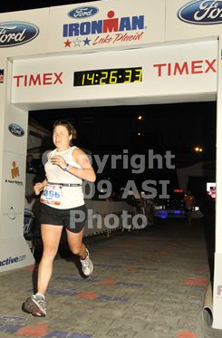 Comments: So... I took all the advice and wisdom and reminded myself "This isn't a race until mile 18". I kept a really easy jog. Was so excited that I jogged right through the first aid station even though my plan was to walk the stations, drink, eat and stretch. I kept the run to the stations, walk the stations strategy as far as I could. Turning on the road at the ski jumps was nice the first time because it was lined with hundreds of signs that the families made for the athletes. One said something about being "Nucking Futs". I thought it was funny. I really focused on them because even on the first loop I was getting slightly dizzy, not bad, but having something close by to focus my vision on was more comfortable than looking ahead. I saw Kelley Hamlin and she looked f-ing amazing. What an athlete!!!! She had a huge smile and spotted me first. I was almost to the end of the first turn around to head back into town when the thought popped into my head "oh. my. god. I have to get my ass back to Mirror Lake from here and then... I have to come back to this point and do it again!". I developed a blister on my left foot and stopped at an aid station for something to deal with it. They scrambled for vaseline (really? I was the first one with a blister????!) and that was great. It really helped a lot. I ran back to town and I cannot express what it meant to me having each individual spectator cheering me up the hills... you all helped sooo much. As I turned on to Mirror Lake Drive I was thinking "wow, I remember being here last year with Mirjam and cheering for people" and in my head I started thinking " yeah, yeah, yeah, go me, go me, go me" I was really cheering myself on.... not a happy cheerleader cheer, but a motivating "just keep moving" cheer. Yanno? I stopped at special needs and the volunteer pulled out my two gels. What the f- was I thinking putting gels in there? There's nothing special about gels!!!!!!!! I was offered gels all 112 miles of the bike and every mile of this run!!!! I sighed, rolled my eyes, and took the little squirt of aquaphor that I had put in a baggy and put in on my thighs. I didn't want them chaffing. Had a baby wipe and wiped my face. Ahhh. That was nice. Went towards town and out for round two. Wanted to find my mom and say "I don't want to go back there... that River Road looks like a death march for some people.. they're so quiet...it's kind of a scary place". But I went. It's part of the deal to becoming an Ironman. You face what's ahead of you because everyone else has to do it too. Up until mile 17 I was so absolutely super wicked freaking proud of myself for running the first 17 miles. The walking was ONLY at aid stations so that I could take in nutrition and quickly stretch the legs and go. I was passing people who had started walking way before my walking turned into a survival technique rather than a strategy. This is the point when something happens to someone during an Ironman... it's hard to explain but the sun starts going down (when it feels like just a few hours ago you were waking up in the dark and eating your cereal in the dark and parking in the dark and walking to the oval in the dark to see the first athletes getting body marked in the dark...). The sun started setting and the athletes stopped talking except for a few pairs that were walking side by side as if they were going for a Sunday morning walk. My mindset started to shift here. I've explained it to people that it felt like the circuitry in my brain started frying. Honestly. My head was getting light and my body was starting to hurt. I approached an aid station and just didn't want anything and didn't want to make the decision of what I'd put in my body. But I had to make that decision. A couple of times. Because it's no longer just 10 or 12 minutes to the next aid station. At this point it can take 20 minutes, or more, to get to the next mile, to the next aid station. I started putting ice in my shirt and grabbed two sponges at a time and would wipe down my arms or put one in my straps on my back. I was putting ice in my arm pits. Yup. For real. I was worried about my body temp getting too high despite the fact that now the athletes were taking those space blankets and I wanted nothing to do with something that would make me warmer. Then I started walking. Out of "survival" strategy. As I type, it seems pathetic and dramatic to use survival when describing this part of the race. But out there... the families are gone. The volunteers are out there with their smiles and they are the most wonderful people for telling you how good you look when you feel like a pathetic blob just barely walking by them. They tell you to stay strong. They tell you you are doing it. You tell yourself that you are in an IRONMAN race and then you tell yourself that everyone told you that this isn't a race. It's an event. And I didn't believe them until I couldn't run anymore. At mile 17 Ironman Lake Placid 2010 became an event for me. Not a race. And I walked. I didn't want to get hotter. I took ice from the aid stations and swallowed it whole. I bit into oranges and I drank coke. It felt like I was only eating oranges and drinking coke and swallowing ice for hours. I REFUSED to let myself even consider walking from one aid station to the next, though. To me, that was unacceptable. I trained for this day. I got up at 4:30am some days so that I could run for three hours to train for this day. I wasn't going to let myself give up and walk more than I HAD to. I wanted to earn my Ironman title. And so, when I could I shuffled. It was a walk with a little more "oomph" but it was getting me closer to the finish line and that was good. The ambulance would slowly drive by like the Grim Reaper. And in those moments my head/thinking shifted from "is it possible I could go to the hospital today? Is it possible that I'll need IV fluids today?" to "Whoa! Gotta look good! Gotta fake feeling good! Don't let them ask y