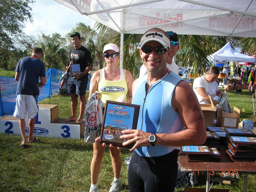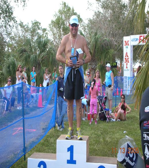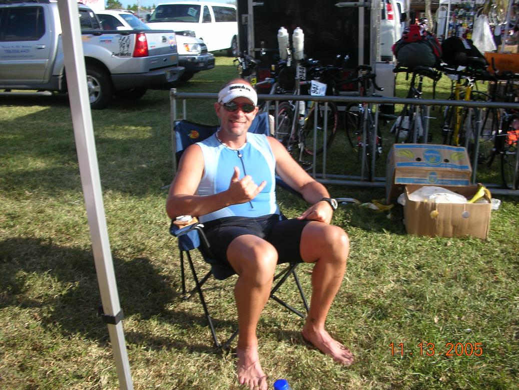 Warm down: walked around and layed out. Got a leg massage from Celine- Mauricio's sister. It was great. Hydrated myself with more Amino Vital. What limited your ability to perform faster: 30 extra pounds around my waist. Event comments: Aside from 2 incidents with some nasty volunteers (1 involving Martha and Mari and the other involving me) the race was great. Volunteers (with the exception of the 2 mentioned hereinabove) were awesome. Everyone was friendly and the race atmospherre lasted from 5AM all the way through 3PM when we left the site. Ran into many old friends and new friends. They are listed in no particular order: Sue from BT- Congrats Sue on your race and thanks for being friendly and hospitable. I enjoyed meeting you and look forward to seeing you again at St. A's. Also, thanks for putting "BT" on my calf. I got asked over 20 times what it stood for. I assume we will have some new members shortly. Jessie from BT- Also Congrats and thanks for being nice. You rock with a 3rd place finish. I also look forward to seeing you again at St. A's. Janelle- Congrats and nice to have met you. Janice Olson- You rock for driving down 2 days in a row to hang out yesterday and to work for free today. It's people like you that make these races possible, fun and safe. I hope some day to reverse the roles and be your "waterboy". Thanks again for cheering for me and I promise to buy more stuff from BPB. You rock!!!!!!!! Also, thanks for the VaVaVa- Vino. I shall enjoy. Mauricio and Gloria at Andante. Not only is Mao the BEST mechanic around, but he and his sisters are good people. His love for the sport and his willingness to help demands respect and admiration. For that I will wear and promote Andante Bikes as much as I can. You exemplify what the sport is about!!!!!!!! Ramiro Cortes- "The Ramster" Congratulations on a great race and an impressive HI time. Thanks for training with me over the last 3 months. I look forward to 2006. Alfredo Meneses- Same as above. Keeks- My bubba. My friend. Don't retire yet babe. Save it for when your ham is really hurt. I luv ya dude. AND last but NOT LEAST................... FRANK COLLADA- My Ambassador of Quan! My Sinse, My Coach, My Friend, My Inspiration in this sport, My Mentor, My Sultan, My Objective, the ONLY Ironman I have the confidence to talk to, My Broham, Thee Chairman of the Board, the Numero Uno Honcho, The Big Cheese. Words can not express the fun, the laughs, the challenges, the revitalization, the lifestyle (the list goes on.....) that I have experienced over the past 6 months hanging out and chasing you. You did NOT have to let me in and yet you did. In an athletic class that far exceeds any long term achievements I could have, you have let me train with you and taken time out of your and your fams life to teach me. For that I am greatful. I look forward to MANY years of Tri-ing and training with you and hope that someday I can repay the favor. You are everything I stated above. You are the reason why I finished 4 races this year when my plans were to not even do one. My victory today is dedicated to you! Thanks bubba- I Love ya. Last updated: 2005-09-21 12:00 AM