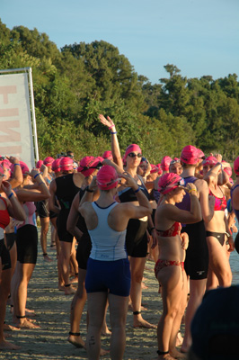 Up at 5:25, had protein drink. Got dressed and walked down to finish setting up T1 @ 6am. Got body marked and dried off my bike and got my chip. Set up my shoes, etc. and then went back to the room and took care of business. Ate a banana w/peanut butter at 7:00. Headed down to the water in time to hang out with the team and see the beginning of the race.