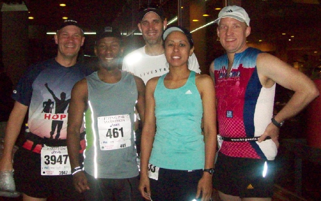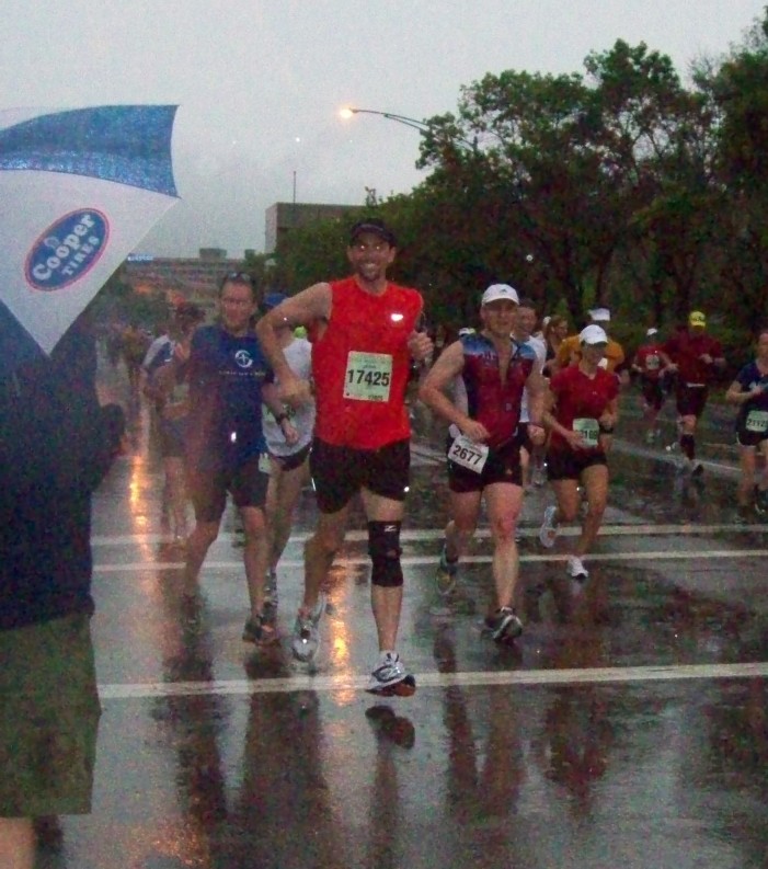 Woke up Sunday morning about 4 to thunder and rain. Ate a bagel with peanut butter and went back to bed. Got up at 5:15 and ate a banana, orange, and a cup of coffee while it rained outside. We're on the 16th floor (out of 21) and waited for 4 elevators before one had space. Met up with Kevin, Derek, Bob Stocks, and Natalie to walk 6 blocks to the start of the race. Derek offered me a trash bag, which would have kept me dry for an additional 32 seconds (not taken).