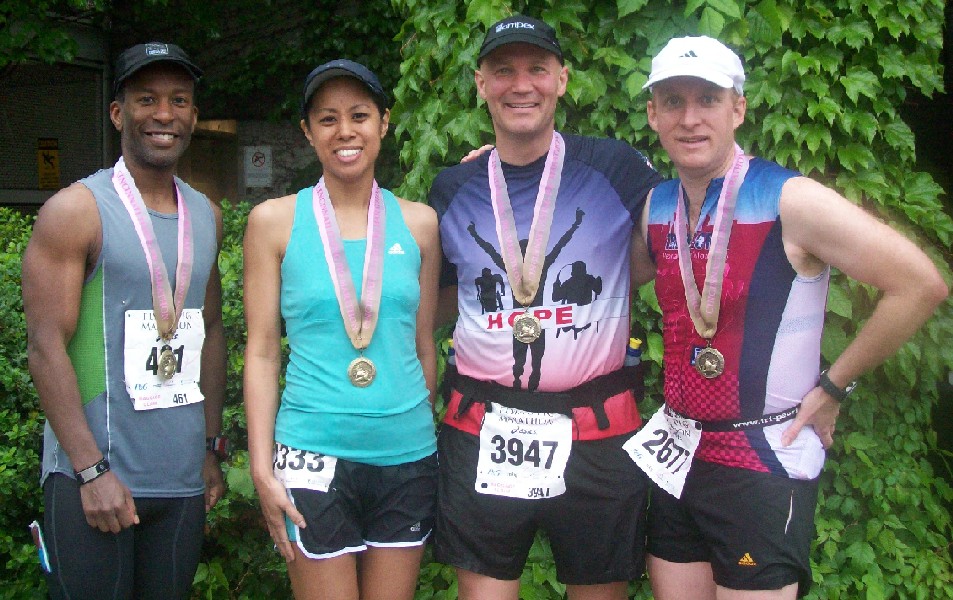 Warm down: Stood around in the recovery area with Natalie, Bob, and Derek until I was completely stiff. Got finisher pictures taken, hobbled back to the hotel for an ice bath and shower. What limited your ability to perform faster: Lack of long runs (I missed 2 weeks of running in March with a trip to India and my long run 3-weeks out). Race-day weather (the rain helped keep me from overheating, but made for heavy feet). The extra 10 pounds of "winter weight." Race strategy to support Natalie's quest for <3:45. I wouldn't trade the trip for more long runs. I still set a PR (since it's my first marathon) in spite of the race strategy designed for Natalie. I can't control the weather, so the only thing I'd really change is the 10 pounds. Event comments: Lots of volunteers and spectators in spite of the wet weather. I don't know what else they had post-race as most people weren't hanging around very long. Last updated: 2009-10-05 12:00 AM