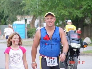 Comments: I felt confident I could run/walk the whole way and come in before 11pm, that was the original goal. I was ahead of my personal schedule by about an hour and felt tired but in good spirits. But I noticed immediately the balls of my feet were tender from the bike. I ran to thi\e first couple stations(every mile) and then walked for a few minutes. The cheering was awsome! Saw a few of the pros coming in , walking as well. Out of town, Crazy caught up and we walked together for 5-6 miles. Somewhere in here, I got my feet wet. Very very big mistake. As my feet were tender already, I really started to hurt. At 12mi, I needed a washroom break and Crazy carried on. I never could catch up as I couldnt run any more, my feet hurt so bad. And still I'd go through the water! At the turnaround, the blister on my left foot popped and I think I almost screamed! It was bad, but there were more people here, then I saw Lisa and Quinn with Glenda cherring us/me on. Made the turn at about 730, so I still had lots of time, though I knew I was going slower. At the 16mi mark, my right foot blister popped and again, I was hurting. Felt like my feet were on fire, swiming around in my shoes and I thought for sure they were bleeding. At each station I took on water, chicken soup and carried a cup of ice chips to suck on as I walked on. It was very dark as I hit the flats and we were given glow sticks to put around our necks. Maybe I was getting lightheaded, but I was still smilling, being passed by all these green hallos. I saw ambulances screaming by, people litterally passed out on the side of the road and others huling the guts out, then motoring on by me. But my condtioning was good, I still had energy to carry on, but baby my feet hurt. I thought for sure they were bleeding. I made it to the 20mi mark at about 930 and was still pretty confident I would be in on time, if not close to the 17hr mark. I was walking about 3mph and getting slower. The period between 20-24 was pretty blurry as I got back into town, hearing the people cheering me on, telling me I was gonna make it! Out of the blue came a girl on a bike, chering me on, by my first name, then I looked around and recognized Freezerburn and Pablo on one side and then back to "the girl" realizing it was Weight2go and Smartcicle. They should me where they had chalked mine and Crazy's names on the road and it just felt great to see and talk to them. They took me into the last mile, where I saw a member I used to work with here in Dauphin and he was yelling and screaming at me, gave me the big hand shake as I made the first turn along Lakeshore. Saw Lisa and quinn there too and knew I was gonna make it. Made the final turn at the end of the beach and the people were going wild with their cheering. There were alot of us in the same boat, coming in just under the wire and it was simply amazing to feel the energy of the crowd. The last stretch all I could think about was I couldnt run over the line but I can walk proud! Then Lisa and Quinn came out and grabbed on and I somehow managed to run/jog/lope/shuffle across! What would you do differently?: Never get your feet wet! I knew this but it never dawned on me what happened untill about 1am when I was having a beer with Crazy and the ladies back in OK Falls. I though maybe the change of socks was a bad idea and he said "you got your feet wet didnt you?" I thought about it and he was right. I walked through all the hoses, shile I watched some people walk around them. ![]() Post race