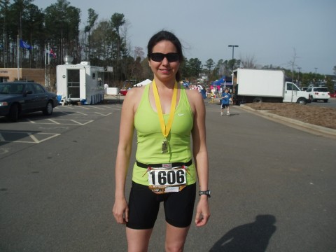 Comments: This was a really good run. This time, I placed myself in the appropriate pace area so it was much easier to get started running at pace. Last time I started too far back and it took a long time to get going. It came fairly easy and I had room to push harder. I was watching my garmin and knew early on that I would come in under my goal of <1:54:00. I wasn't sure how long I could hold the pace, so I elected to just stay steady where I was rather than make it hurt. I'm happy with this as I know I have room to improve. According to McMillan, this pace says I am capable of qualifying for Boston 2012 (age up to 45) when I run my full mary next spring. I won't have time to build my run during Tri season, but as SOON as B2B is over, I am changing my slogan to "Marathoner in Training!" Racing always makes me smile. It made me feel good when I was running and someone on the sideline pointed at me and said, "Look at that BIG smile!!!" Made me grin even bigger... Results: http://tobaccoroadmarathon.com/file_library/trmhalf_age_results.htm What would you do differently?: Nothing really. Other than maybe push harder when I know I can. Actually, I should use a fuel belt for the longer distances. I have a lot of trouble pausing at water stations and then "trying" to get the water into my mouth and swallow it. I stopped and walked three times at aid stations to drink water during this race, and it threw off my rhythm. I train with a fuel belt for 10+ mile runs, so I would be fine to use it during a race. Which reminds me, I only drank water on the course. In training I usually use Nuun which is a sugar free electrolyte tablet. I better be more careful about electrolyte replacement during races. I've never had a sports drink before, and usually only grab water on course. ![]() Post race