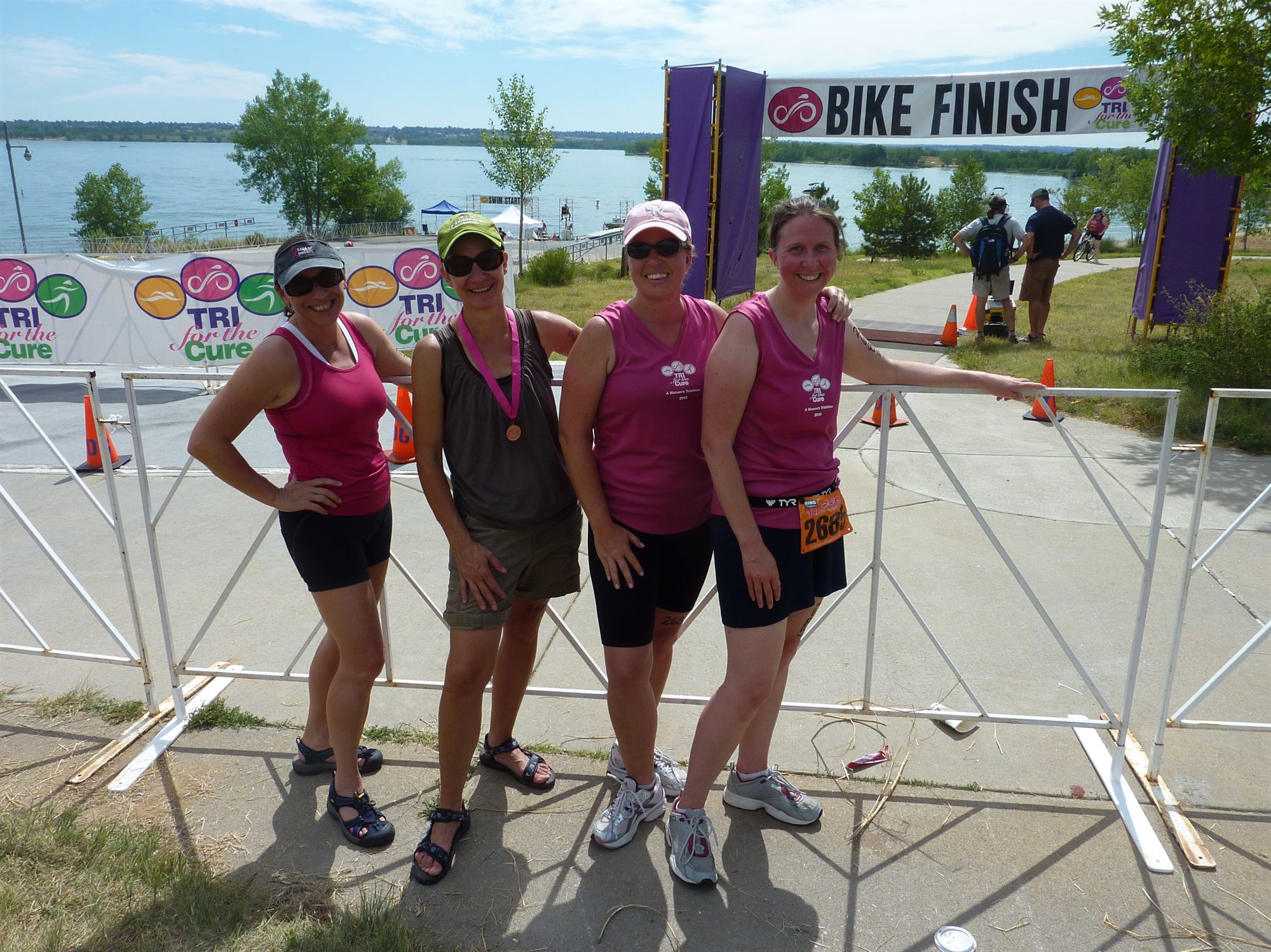 out of the house at 4:40am eegadds so early. picked up shari at 5 and katie on the way at 5:30-arrived at the race neighborhood at 6 and hit the traffic jam...15 minutes to park in a nearby neighborhood and walk the mile to the park. My swim wave start was 7:24. Just got all my stuff in the transition area and down to the water at 7:05 to watch the survivors and elites start.