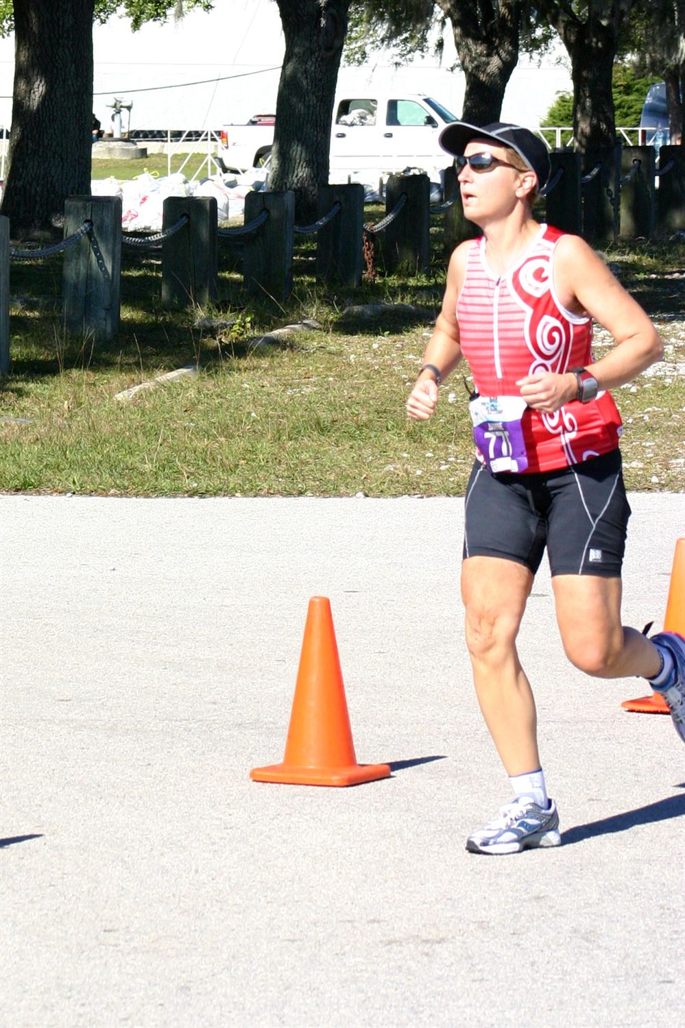 Comments: Felt great coming off the bike. Line for port-a-pots in transition so ran to first aid station and went there (in other words, run includes potty break). Ran well for the first bit and faded. Lots of crowd support downtown! It was great! Just after we got to mile three I was thinking, "Almost a quarter of the way done! Woo hoo!" Then a spectator said, "They have 10 miles to go." :-0 I thought we would never get around the park. We got on the path and kept going and going and going. I had a gel just before the turnaround. I saw Stan, Lisa and Fred before the turnaround and then spotted John and Jerry after the turn around. That part was really nice. Heading back to downtown seemed faster. I got over the little bridge OK. Then I saw the Big Bridge. Oh my! When I saw that last bridge I wanted my mommy. OK, not really. It just looked very intimidating to me and I kept on thinking that I wanted to run the whole thing so I kept on trucking. I got water at most but not all water stops. Stomach started to rebel with 3-4 miles to go on the run. What would you do differently?: Run more! ![]() Post race