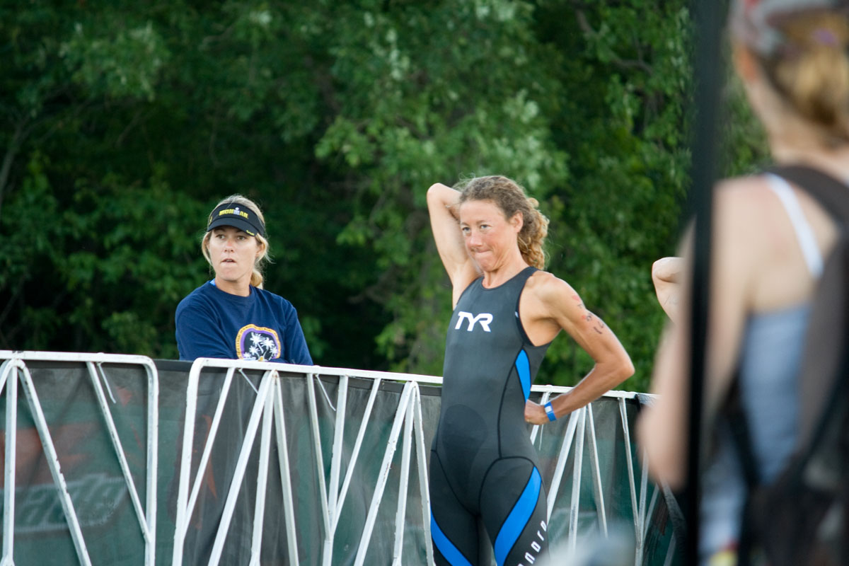 Woke up at 5am and ate a bagel with peanut butter then a banana. Downed my OJ and headed to T1 around 5:30. Setup T1 and heard the swim would be wetsuit legal. I was glad to hear that and headed down to T2. Put down a very colorful towel under my front wheel to help me find my bike. Used my new Sportslick tube and I think it works a lot better then Bodyglide since it comes out of a tube into your hand like toothpaste. It was super easy to apply (Sold on that product). Ready to go and headed to the swim start to watch the Pro’s!!! Chris Lieto walked by me and I wished him good luck. He said, “Thanks!” which was cool!