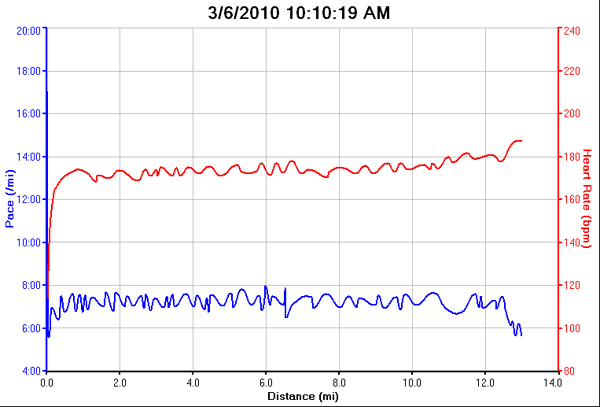 Comments: Anytime you PR (personal record) it is a great race! :-) I had a great run. I ran steady and watched my pace and heart rate pretty much the whole race. I generally carry all my nutrition with me on run races. The day before the race I looked at last years pictures and noticed very few people were carrying bottles or wore a fuel belt. I was considering carrying less than what I trained with to be “lighter”. I decided to stick with what I am use to and wore the fuel belt. I carried three bottles on the belt. Two contained water with Cytomax the third contained two GU’s and water. I was glad I brought everything I did I used it all! The first 1-1.25 miles I spent trying to get my mp3 player to turn on. I charged it before departing so I couldn't figure out why I couldn't get it going. Even though it was cold, the sun was out and I couldn't see the screen to see what was going on. After about a mile I decided just to leave it off and run. I later found out it wouldn't turn on because the battery was low? Huh?!!! There were a few race packs (of people) I tried to draft behind but each time I did, their pace was faster than I wanted to go. I tried to stay between 7:05-7:10 pace and if they were going too fast (consistently) I let them pass. I was drafting behind one girl going by a water station and as she went to get water she bumped the person who was handing it out and the cup fell to the ground. At that point I was really glad I was carrying all my hydration with me. This race is known for being really windy. The first 6.5 miles we had a good head wind going. I couldn’t wait til I got to the turn around so I could have the wind to my back and I could put up my sails and fly!! Unfortunately, right after the turn around the sun shined warmer and brighter and the wind seemed to die down!...No!!! I tried to keep a steady consistent pace. At the end of the race I had a kick. I wanted to leave everything on the course. Later looking at my GPS data my heart rate shot up high than it ever has 188 bpm! Last year 400 people ran this race, this year 750 participated. I would highly recommend this race to anyone who is interested in running it. It is flat, fast and beautiful! What would you do differently?: Run FASTER!...and try to hang with those packs that passed by me!  Post race Warm down: Drank some water, ate lots and did a short 3-5 minute warm down jog. Put on some shorts and put my legs into the chilly waters of the Snake River, painful at first, but certainly helped with the recovery! Event comments: Event started 10 minutes later than scheduled. Results http://www.palouseroadrunners.org/SnakeHalf/2010/SRCHM-FINAL-SUNDAY... Last updated: 2010-02-27  12:00 AM |