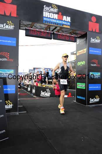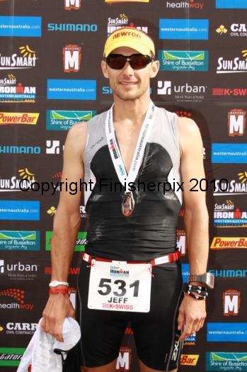 Comments: Once I started running I felt really confident because I felt really good. I was surprised at just how good I felt. My plan was to run the first 10km at a 5:58km pace and then the remainder at 5:38/km. I really struggled to run at 5:58 and constantly had to slow myself down. Once again I was being passed by what felt like everyone! The first 10km went by, the supporters were fantastic, they yell your name and cheer you on because you have your name on your race number, the people at the drink stations are so friendly you almost want to stay and chat but my plan was to take 30 steps in each aid station. I was still feeling great. I was given my first wristband (you got a black wristband for each lap you complete, once you had three they gave you a red one so you could run down the final chute) and I was happy to see my family in the crowd. The second lap went by very much like the first and I was still feeling good but I knew something will happen soon, everyone says you hit a wall at some point. It was around the 30km mark that all that feeling good was now gone and I started to feel sore in my quads and feet. My pace was exactly where I wanted it and I kept saying to myself to just hang on to this pace and it will all be over in a hour or so. I started feeling cramps at about the 32 km mark and I was worried it would be the end of me. I didnt want to make my stride and longer or kick my legs any higher because I could feel a cramp each time I moved out of stride. I saw my wife and son and I told her I am hurting...she said keep going you only have one more lap to go! I pushed on but my pace was now slower than my goal pace and even my slow first lap pace. I hung on hoping for an aid station to appear because I could get 30 steps to relax. I started eating everything at the aidtstations, Watermelon, Jelly Beans, Oranges, Pretzels and Cookies. They never tasted so good all together in my mouth he he.! I also planned to start drinking cola on the last lap. Cola ended up being my drug of choice for the last lap as it gave my a kick until the next aid station. Everyone around me with three wristbands was walking at this point and I was still running, slowly but I was still running. I think I passed close to 100 people on the last lap as I lost count. When I got that red wrist band I knew I was only 400m to the finish line and I started getting overwhelmed. I saw all my training flash past me and I knew my family would be waiting for me. I pushed on and as I went past the gate to the finish chute this time they let me in because I had a red wristband on. It's absolutely amazing to run down that chute with people cheering for you and then hearing your name called "Jeff Grbelja, You Are An Ironman!!. I looked up and saw that I went sub 11 and I was really please with myself. I crossed the line and I was immediately grabbed by some volunteers who helped me down some steps to head to the massage tent. I then heard my wife and son call my name and I went over to them to give them a massive hug and kiss before I walked to have a photo and a massage.And food!!!!! What would you do differently?: Nothing...I think given everything I ran a good marathon. I ran the entire way (except for the 30 steps in the aid stations) and I felt I could not have given any more. I knew I would slow down toward the end but my race plan was to delay the slowing down as long as I could. this was my first marathon so I had no other experiences to base my run from. ![]() Post race