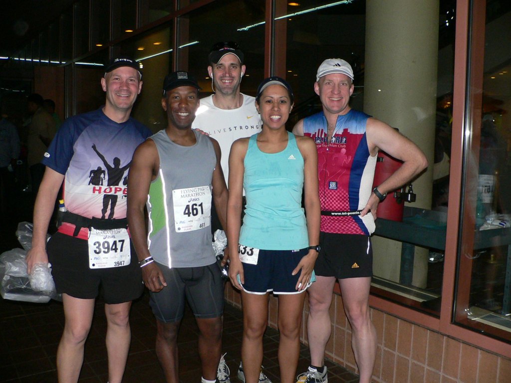 Being my first marathon I think even my 9 month old was exicted since she got up at 2.30am and made sure mommy and I were up too. Finally got moving about 4.45 and had coffee and a cliff bar as we made our way to downtown. Stopped at my office for a quick restroom break and a quick strech since it was lighting and raining outside. Rain was steady and moderate at this time.