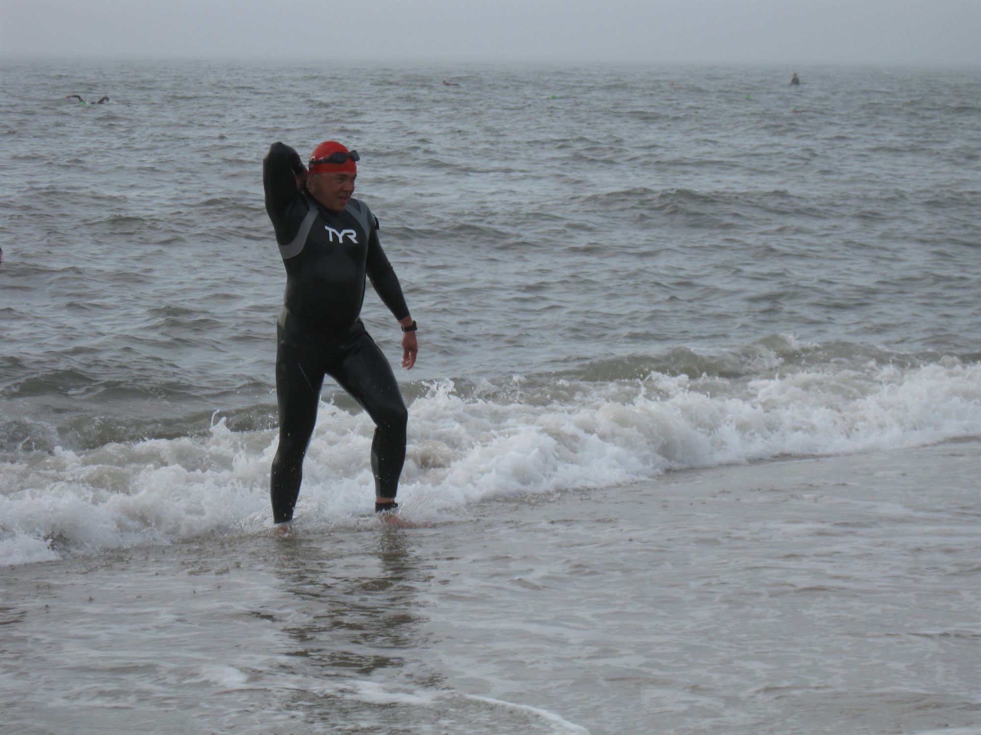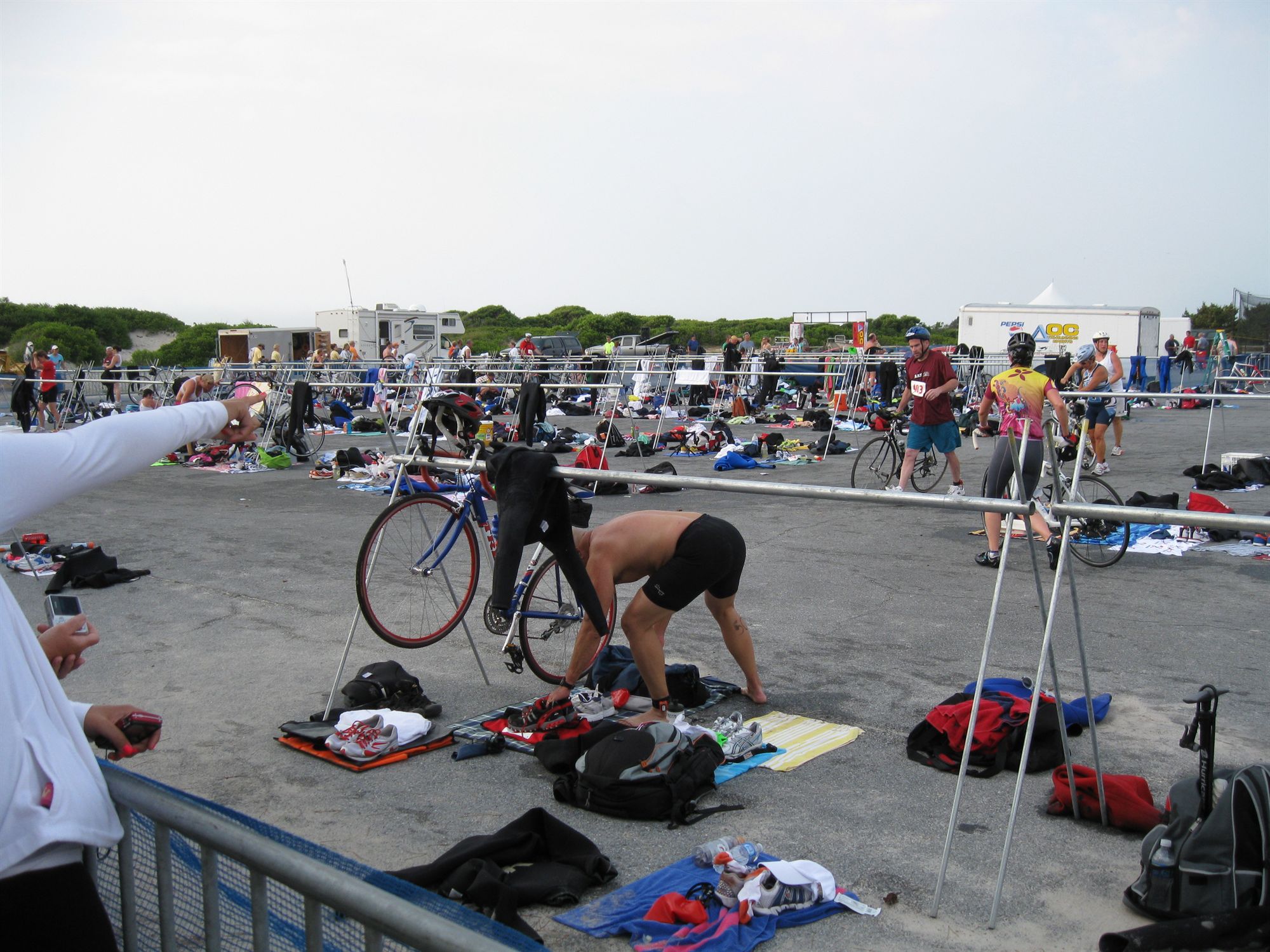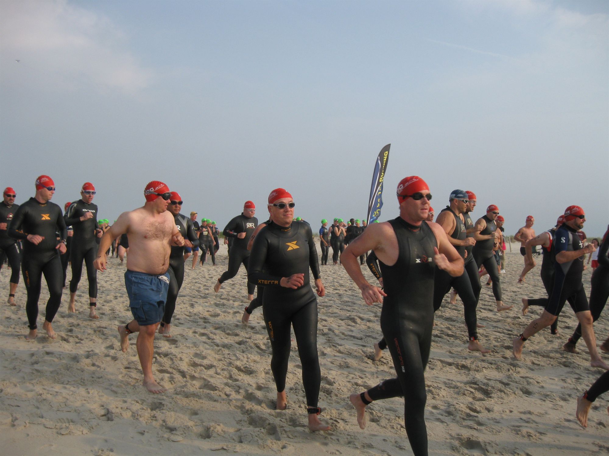 Comments: We were divided into 6 waves each spaced out strategically that I did not see any major "washing machine" type starts that you see in most triathlons. For the most part, people were just approaching their entry into the ocean at moderate adrenalin driven fashion. I was in the 5th wave. We were given the 1 minute warning to get ready. I took a deep breath, made the sign of the cross and all I remember doing next was starting my stop watch and saying to myself..."Bring It"! The sound went off and I made sure I was at the back of the pack. I walked/semi ran into the ocean and was confident I would at least make the 1st buoy as there were no waves at all. I got to my first one and applied my plan to conquer this section of the race. The plan was to swim to each buoy in two segments. First doing freestyle and the second doing combat side stroke. That I did pretty much from one buoy to another. The other plan was to stick with my speed and not get carried away by faster swimmers. The buoys were hard to sight as the weather was overcast and there was some very minor fog that obscured our vision. I am also near sighted and my swim goggles are not prescription ones. The good part about the overcast was that we did not have to worry about the sun glare. After reaching the 2nd buoy, I noticed the 3rd one was further toward my right. I had to navigate toward it which probably took a good 3 minutes of my time. They had set them up but the 2nd one was not lined with the 1st, 3rd and 4th ones. The 6th wave group started to overtake me even before I reached the 3rd buoy, at which point one of them, a female, overtook me and I followed and drafted so close I could almost touch her feet, and then she took off like a rocket. When I reached the 4th buoy, I gave it all I had and swam as fast as I could back to shore. Got out of the water, ran to my wife, gave her a kiss, patted my son on the head and ran toward T1. What would you do differently?: Nothing! The swim segment was the very reason I wanted to be a triathlete. This was the demon I had to face. I started training 7-8 months ago and did not know how to freestyle at all. I have always had the fear of deep water and drowning. The methodical approached I took in training for this by watching other people swim and applying what I learned from watching Total Immersion DVDs coupled with the advices and suggestions given to me by mostly the great Maryland BT group folks was more than enough ammo to prepare me for this segment of the race. So as far as my swim ability was concerned when I first started this, my overall swim was good! ![]() Transition 1
