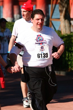 After about a mile we were back onto the backroads headed to Animal Kingdom. I kept telling Roy that mile 13 was the magic mile. At that point you know you're going to do it because you're halfway done and the hard part is over. You're miles are getting "smaller" (as in 14 down, 12 to go instead of 12 down, 14 to go) and while your body is getting more tired, mentally you feel like you're getting there. Right after mile 13 we saw Tigger and Pooh off on the side of the road and ran over there to get out pictures taken. (There were characters throughout the route.) I turned around to talk to Roy and his face was PURPLE! We still don't know why, but for some reason he found himself unable to catch his breath. I led him away to the side of the route because this has happened before and we know how to get through it. We were both afraid if a medic saw it, they'd make him stop. I held his face in my hands and talked him through the panic that goes with it until he was able to breathe again. Who knew he'd have such a voilent reaction to Tigger! We made sure to avoid Tiggers for the rest of the route!