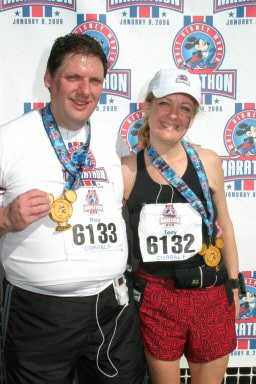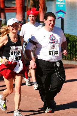 We found ourselves finally back at Epcot right at mile 25. I was ready to just book it in, but not Roy so we did a lot of walking. It was KILLING me I tell you. KILLLING ME! I wanted to run so badly. I really have never felt so good at that point in a marathon. But we were in this together, so we grasped hands and waved at the spectators. At that point 5:15 and 5:30 were well out of our reach, but the finish line was coming! As we were almost to mile 26 Roy felt like he could run it in the rest of the way. We turned the corner right near mile 26and there was Linae, cheering us on. (Linae is from the Penguin Athlete's mailing list. We'd had dinner with her and some other PAs on Friday night.) She was QUITE the welcome sight!