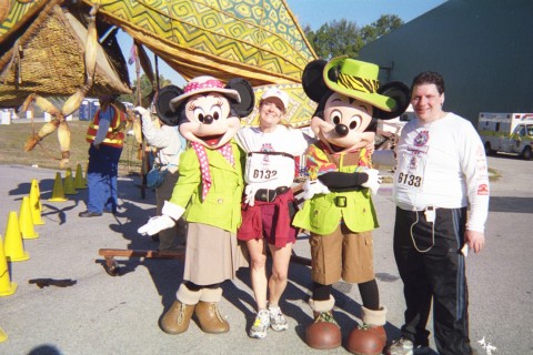 Got up and ate a bagel. Put on lots of layers because it was FREEZING...yes, literally FREEZING in Orlando, Florida. Caught the bus to Epcot at 3:00 a.m. where we had to walk pretty far to the spectator area, and checked our bags. Walked half a mile to our corral and stood for over an hour in the freezing cold waiting for the start. It was unseasonably cold (about 30 degrees) at the start. We had had to purchase gloves, a hat, and tyvek sheddable shells at the expo the night before because we'd brought only warm weather running gear!