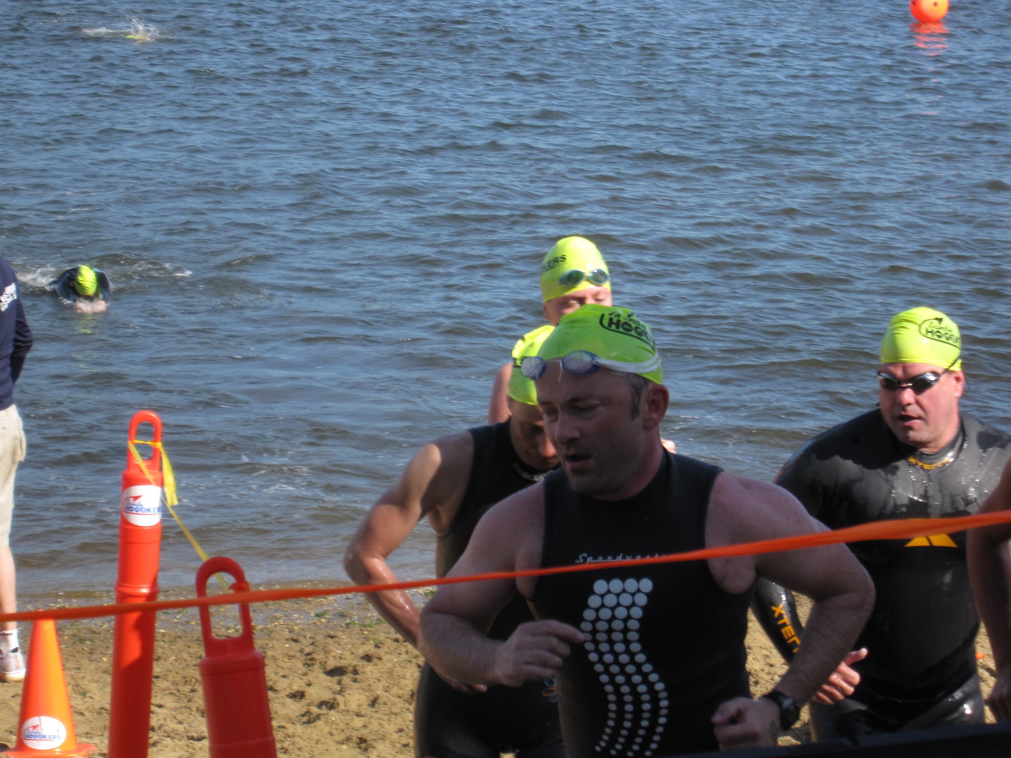 We parked and took a school bus to the waters edge, I picked up my hat, timing chip and got numbered up. There was a nice vibe at the event, lot of people seem to have turned up on the day and entered, and a few seemed to be planning long rides/runs after the swim. I met a couple of folks I knew and chatted with them, then it was into the wetsuit and did about 200 M swim out to buoy and back.