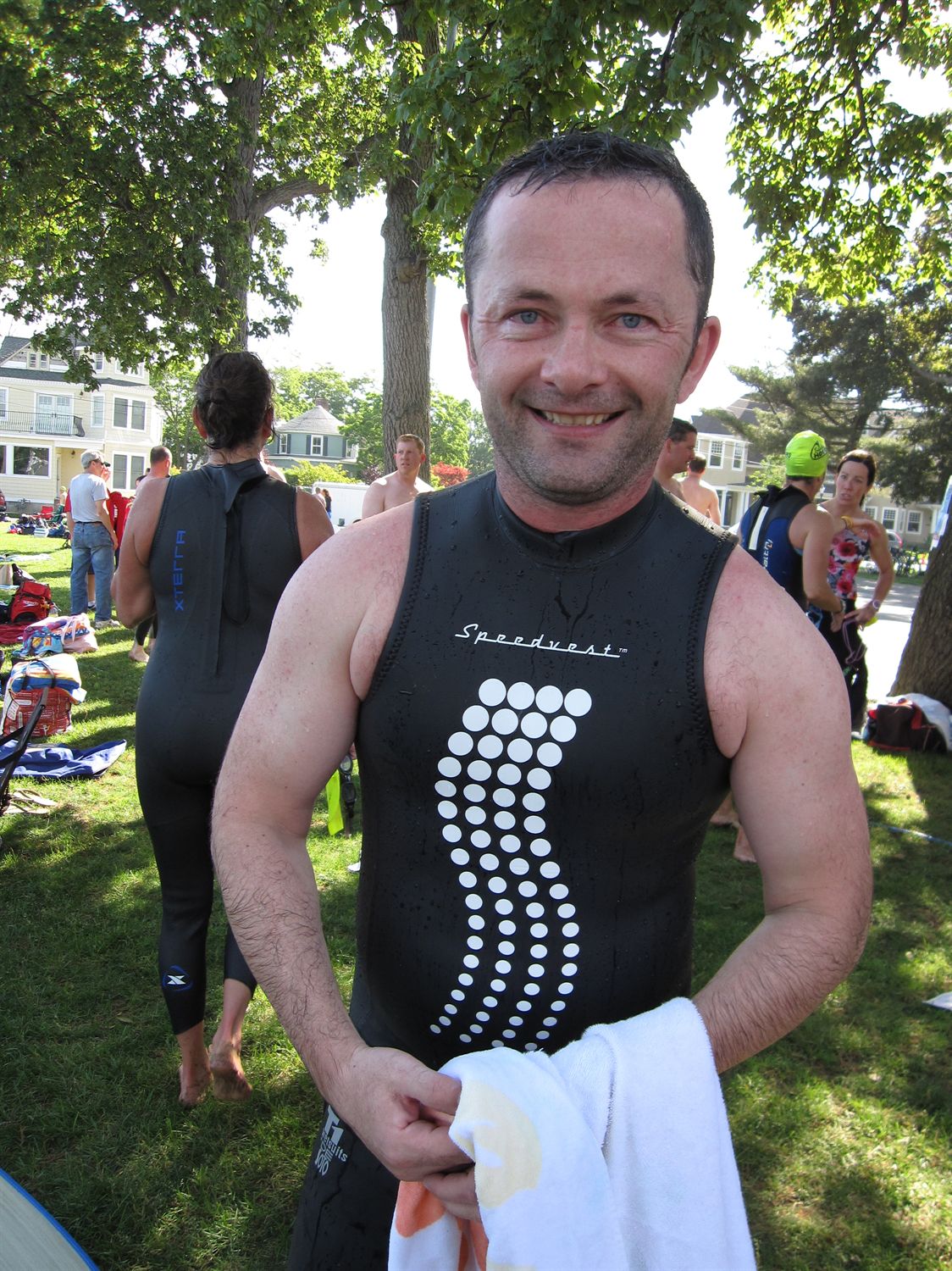 Comments: Once the pre race nerves had been tamed, I started out with a decent rhythm which was important for me. During my previous swim my heart rate had been jacked at the outset and I tired quickly. Not this time. This was probably my most comfortable swim ever in terms of pacing myself. I've been working on form and stroke rate to try and improve my overall performance and it paid off. This was my best swim pace for this distance by far. My sighting was very good and I made a very concious effort to swim buoy to buoy. I'd been reviewing videos of sighting on line and practising and this helped a lot. I managed to draft off knees of some swimmers at a few stages which helped. I took a solid kick to the eye about 10 mins into the race and had to adjust goggles and restart but I recovered pretty well which was great. As I rounded the third from last buoy I saw my watch read 23 mins with roughly 1/3 of the course left. This gave me a big boost mentally to keep going and do a decent time. I pushed on past the boats lining the jetty and I knew once I turned the corner I was on the home stretch. I really pushed hard to get to the beach and cross the timing match. There were lots of supporters cheering us on and I spotted Elizabeth just as I crossed the mat. My watch said 37:01 and I was very pleased with that. My goal had been to do the swim under 40 mins. Mission accomplished! I also have to say I was not at all tired after the swim. I felt like could have hoppped on a bike and rode 50 so my conditioning is improving slowly but surely. What would you do differently?: Goggles. Those darned goggles. Foggy, misty, blurry, can't see thru 'em goggles. I bought a pair of Tyr socket Rockets a few weeks back, and they are great, once you adjust them they fit well and the visibility (when clear) is fantastic. For some reason in both pool and OWS they fog up very easily. I had to stop at least a half dozen times to clean them as I could not see the bouys through them. This cost me a minute at least over the course of the swim. So I think it's either research new googgles or try out some anti-fogging spray and see how that works. ![]() Post race