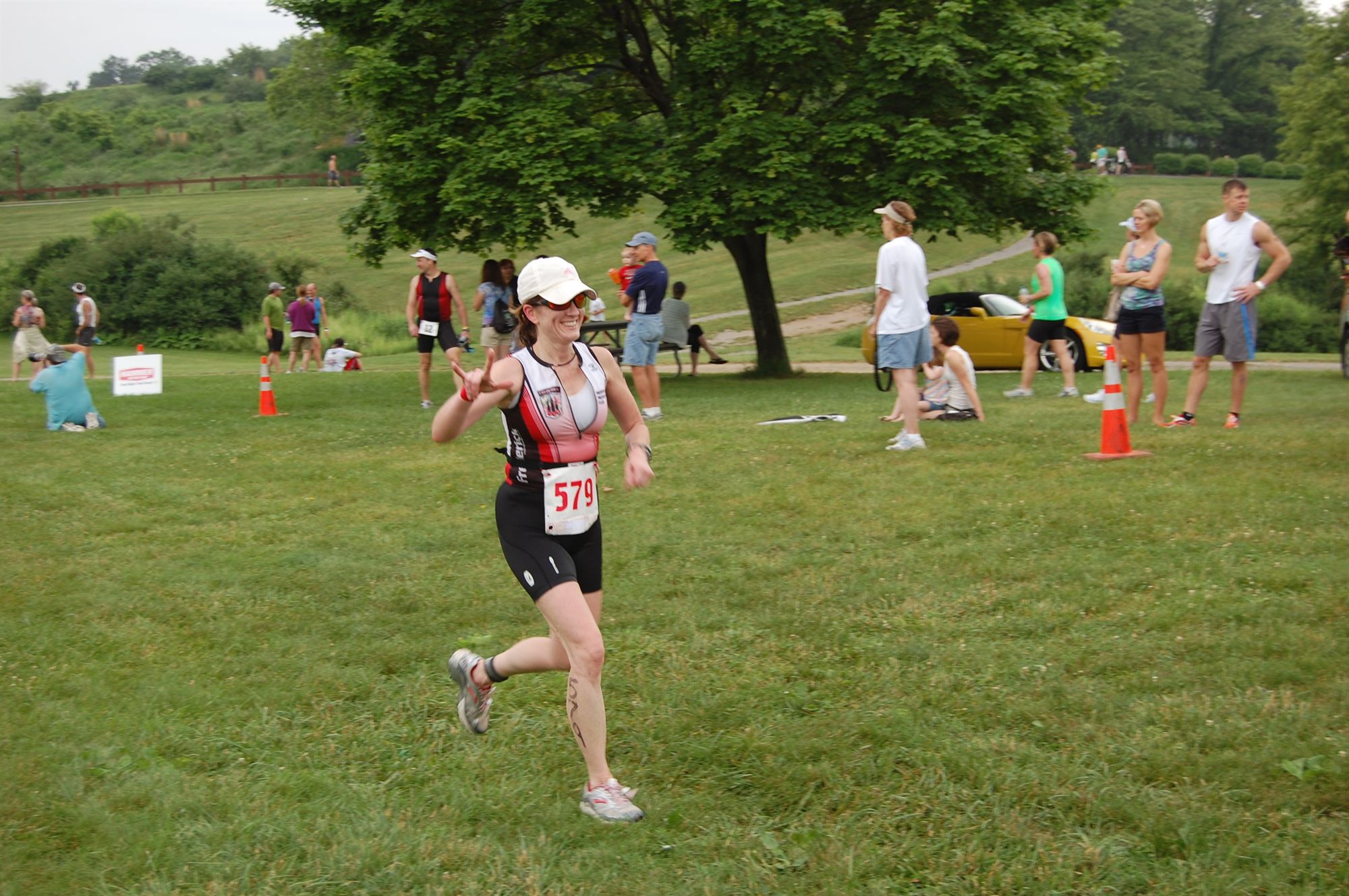 Comments: (Estimated time) I think this T went really well. Although I was slow running through the area with my cycling shoes on, once I got to my spot I was quick. Racked bike, helmet off, shoes off, running shoes slipped on, grabbed my hat and race belt, and took a last swig of HEED. My younger daughter yelled, "Mommy - you're so fast!" I yelled back, "Maybe I'll win!!" :)Ran out to the course and put on my hat and race belt. Ready to run like the wind. What would you do differently?: Nothing. It went as planned. ![]() Run