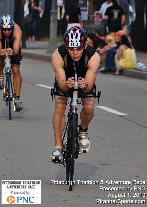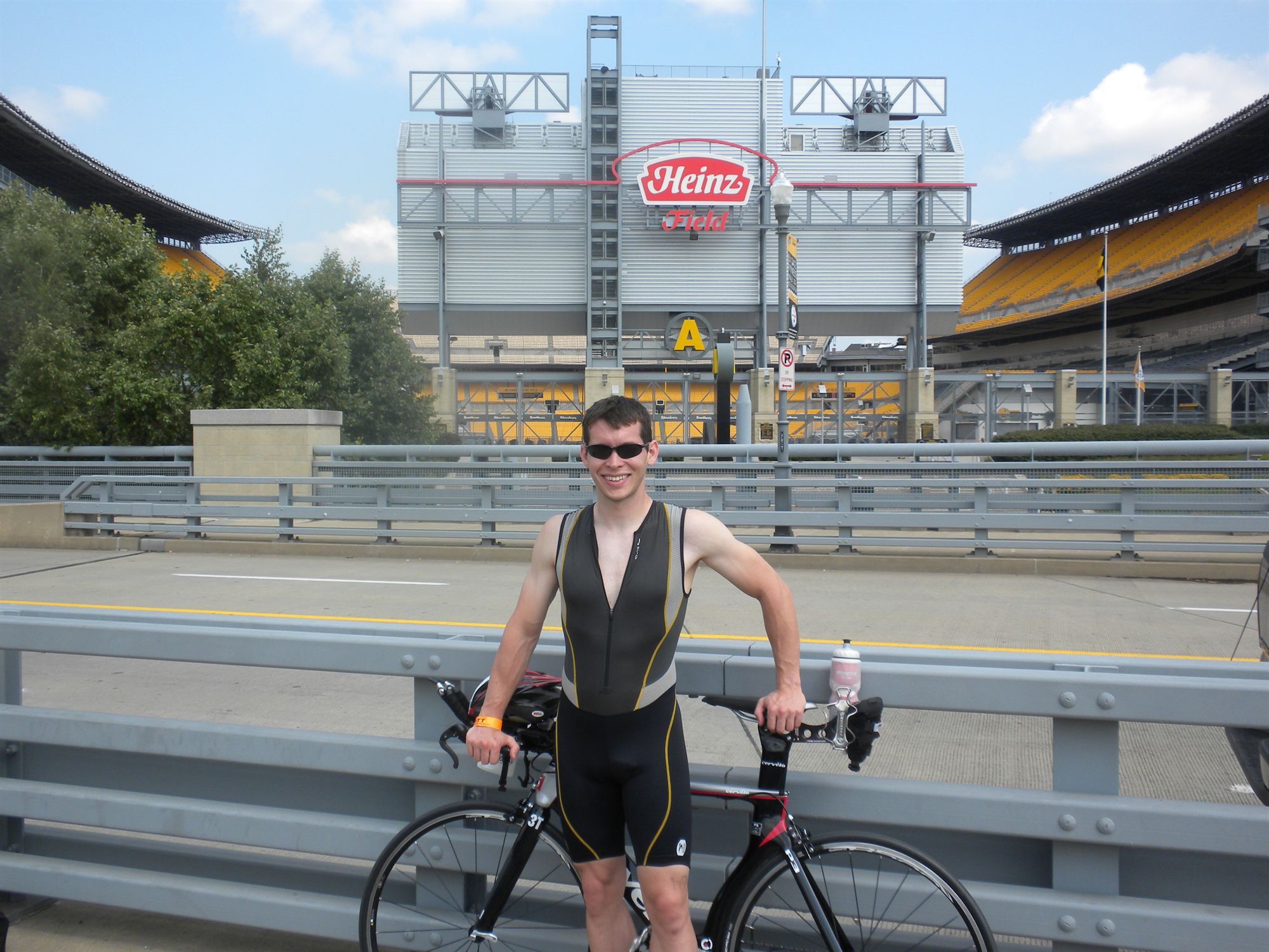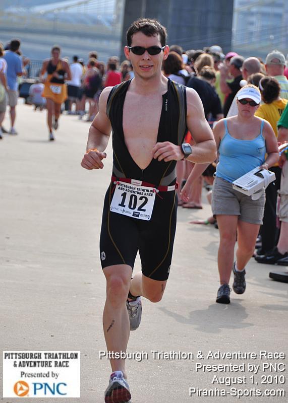Warm down: Drank water, did some stretching, drank my Endurox, got a massage, put on my recovery compression socks, walked around the expo and waited for results to come out. What limited your ability to perform faster: Hmm, a 12+ minute PR for Oly distance and I have to figure out how I could have gone faster... 1. Recovery and rest - while I wasn't planning on tapering fully for this race, I did back of my training the week before (from 10hr to 6hr). However, I did a really crappy job of resting up - definitely needed more sleep in the days leading up, and could probably have used a little more yoga - I felt very tight the day before and day of the race. I did a good job pre-hydrating the day before, but I should have been smarter with the amounts that I ate. I suppose it worked since I barely fueled at all in this race and didn't bonk, but I think I may have felt better pre-race. 2. Mental errors - my timing strap issue and zipper issue on the swim, biofreeze issue in T2. 3. Posterior tib tendonitis - I just made it back to 6 miles for the first time in a month about 6 days before the race. I obviously ran well, but makes me wonder how well I could have run if I hadn't injured it. Event comments: Overall good - well organized, ok number of volunteers, course well layed out. I would definitely like a swim warm-up, though - personally, I think it helps me quite a bit. The bike course is a little boring and a little crowded - a not very scenic ride on a narrow concrete highway. The run course was also slightly ambiguous - I get the feeling that we were supposed to be running on the left, but we were all running on the right. At one point, the out and back legs crossed each other - not a huge issue, just minor details. The pre-race meeting and post-race ceremony were held right next to the big inflatable tents - meaning all you could hear unless you were squeezed up front was the air compressors/fans keeping the tents inflated. Besides the finish line, it was also very hard to find water post-race. The expo was nice, the main area around the race/transition site is beautiful and probably good for spectators, the trophies and medals for award winners looked good. I think a race this size (not huge, but not small) could have some sort of finsher's medal or towel. They advertised a finsher's "Terrible Towel" on the website, but all we got was this crappy blue towel in our race packet - so you didn't have to finish, and it wasn't even the right color! I mainly did this race because I'm a diehard Steelers fan who doesn't live in Pittsburgh - and for me it was cool to be near Heinz Field and I got some pics of me with my tri stuff in front of the stadium (minus my football season facepaint and Polamalu jersey). Besides being a good course to set a PR, I probably wouldn't be able to find another excuse to make the 5 hour drive down the turnpike to come back to it (different answer if it was closer, though). Last updated: 2010-06-08 12:00 AM