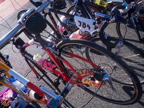 I stayed at a friend's house which was about 70 miles from the race start, so I got up super early, grabbed coffee and a peanut butter sandwich, and hit the road. Arrived in plenty of time, even got the exact same parking spot as last year, and the same rack in the transition area.