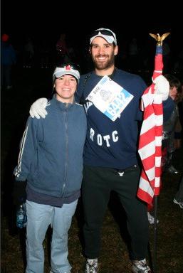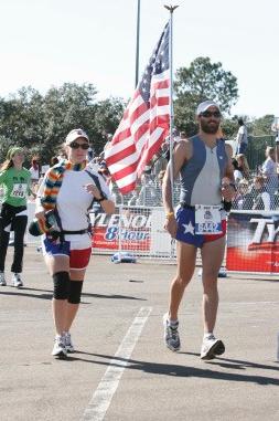 Comments: I was feeling a little sore from the 1/2 the day before so I knew this race was going to hurt towards the end and I was mentally prepared to walk at the end. My plan was to follow a run 10/walk 1 program, and walk the water stops. And the race begins... The first couple miles were very crowded, as expected, so we were below our pace which was fine. After the first mile I realized I was going to have to go to the bathroom. "Great" I thought, I hope this doesn't keep up all day. (I've had bathroom issues in years past) By mile 3 we were in Epcot and I saw a real bathroom so I stopped, I was willing to wait a minute or two in line, I was happy it wasn't a porta potty. I came out, put on all my crap-running with an iPod, race belt, snot rag, and throwaways, and we finally got back on our way. Running in Epcot, through the tunnel of Christmas lights and around the tree was breathtaking. "Go Aaron! Way to go!" yells the crowd. Somewhere around here Aaron made his first smart-ass comment of the day, congratulating me because my Garmin kept mile splits without me having to clock them myself. Let the easy run with a friend, chatting and smack talk begin. The theme of the day was my large behind and general cluelessness. It started out innocently enough with a joke about my butt about every mile, maybe a little more than that. We were having a pretty good time, going at what should have been an easy pace, but my legs were feeling heavy at mile 6. Not good. Around here at a water stop Aaron tells me to get moving and because I'm not thats why my ass is so fat. Insert a general GFY retort. A lady looks at me and asks "Why are you running with him?" Her tone implies that she knows he might be joking but she wasn't sure. I assure her its really funny and he doesn't verbally abuse me and is just trying to keep me going. Still moving along...It was still dark out, there is heavy fog and I was still cold. I had on a long sleeve shirt, my ear warmers and gloves even at mile 9 when we approached the Contemporary Resort where the monorail rides though. We couldn't see the top of the building the fog was so thick. The conversation drifted to my trouble with taking gels, gu's, or any like substance during a race. (insert big-ass joke here) Aaron suggests and describes Cliff Shot Bloks to me (gels in a gummi candy form!) and they sound awesome. Before we even got to the resort, there is a pack of Shot Bloks on the ground!! They are Cran Raspberry, so good, nothing like taking a gel! "I wish I would have thought about getting those before the race," I say, "those are great!" He then tells me that the Strawberry ones are good and the lemon-lime are tolerable. "Humm...I'd like to try those," Well not even a mile later...Lemon-lime!! Ok, this is just too funny. Aaron says he wished he brought his camera and I remember: my cell phone! "I have my phone!! Chippy made me bring my phone!" Excellent. I reinact eating food off the ground, but then proceed to actually eat the Shot Blok. (Insert several minutes of fat jokes here). I didn't want to waste the Bloks, they'll keep me from having to use my Cranks and risk getting queasy. We enter the Kingdom. "GO AARON! Run Forrest!" more crowds yell. I told Aaron that I'd be on the lookout for a guy I met in the airport that works for ASI, he said he'd be taking pictures at the big hat. I had no idea what this was, but we were on the lookout. The Kindgom was awesome, there were so many spectators! At the water stop on the way out I stopped for my first packet of Tylenol and my 2nd or 3rd Biofreeze application on my thighs. This is getting fun. I tell Aaron I need to go to the bathroom and since we're walking now is a good time. "I'm not getting in a porta potty, I'll wait for a clearing in the trees," Make my way into the brush, Aaron thinks hes waiting by the road blocking me but I tell him when I'm done that he just drew more attention to us. Oh well, I have no shame anyway. We approach mile 11 and I stop to stretch. The crowds keep shouting "AARON!" We are still in awe that I have my phone and it becomes a mission to catalog the race. I guess making fun of my butt wasn't enough fun for the day so picture taking it is. We keep an eye out for funny photo ops, and we find a gaggle of Army boys! Flag, girl, boys, perfect. "No Aaron I will NOT ask them if I can hump their legs! NO!" "But come on! It'll be fun! Think of the picture!" "N.O." He settles for a regular picture. We are on our way. Approaching mile 12 more runners comment on our Texas shorts, there were many other Texas runners in the race. Not long after, one of my favorite Texas songs comes on-Bowling for Soup, I start singing, or what I thought was singing along. Aaron tells me I am in fact just yelling and to share. Trying to share an iPod while running doesn't really work but we tried. Right before mile 13 I tell Aaron I'm going to take an extended walk break (he knew I was done, I wasn't sure yet) I need about a mile to just walk (insert butt joke here), go to the bathroom (again), eat and rest (insert butt joke), and get more Biofreeze. I'm really not feeling good. I tried to jog a little at 14, and didn't make it that far. We just start walking and talking and talking to people around us. "Thanks for carrying the flag," they say to Aaron. "HEY TEXAS! WHO HOO! GO AARON!" they yell. Miles 14-16...walking and walking. I stop for a photo op with the "Critter Crossing" sign while we were in a wooded area-reminded me of the swamps-and a "Bear Crossing" sign in honor of BT's very own expert. The camera was delayed, so my ass looked even larger than it really is so several more minutes of jokes from Flag Boy insued. By this time he is known as "Flag Boy." I am really not feeling good at this point. It was not all fun and jokes, but they did keep my mind off the pain. I was not walking in a normal fashion. My forward motion is not what one would actually call walking. I was struggling to keep up at a decent pa
