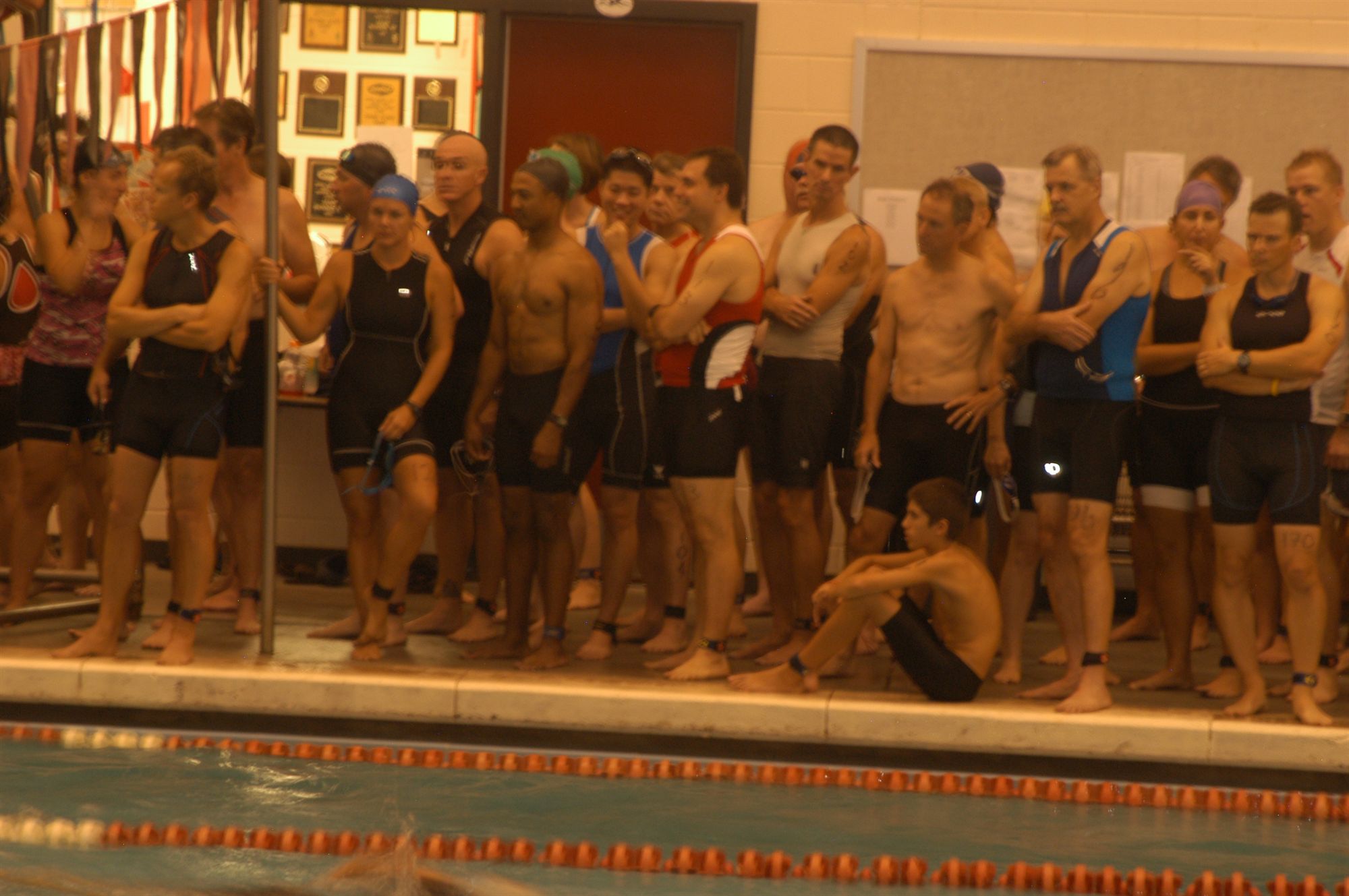 I checked out the bike start and run start areas and went in to evaluate the pool. Again, a volunteer was very helpful in explaining the 10 second staggered start process and the way to loop into each lane. The start was at one end and you were to swim on the left side of the lane down and back and then duck under the rope into each subsequent lane until you reached the wall for the final lane, equaling a total of 400 Meters. Once you hit the wall, you had to backtrack a couple of meters and climb up the ladder.