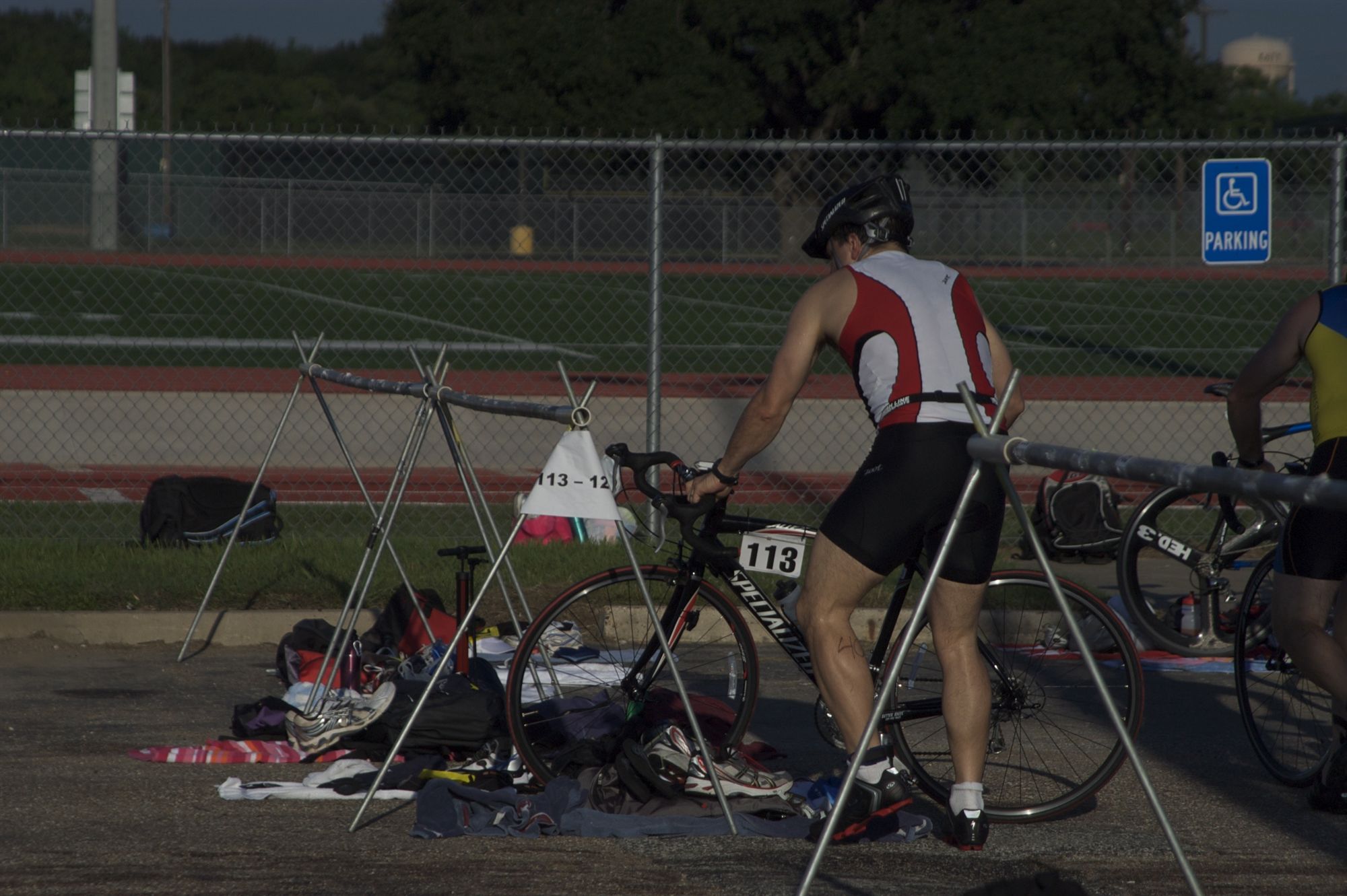 I got up at 4:00 AM and left Kingwood, TX around 4:30 AM. Ate a Snickers Marathon energy bar for breakfast and hydrated with Gatorade and water on the way. When I got there it was pretty dark and there is not a lot of lighting in the parking lot of the Merrell Center. Thankfully a good Samaritan helped me out with a flashlight as I pumped up my bike tires in the dark. The walk to the transition area was easy and I got some help from a race official to help me set up my transition area in compliance with the rules (items should fit within the space between the crankshaft and the end of the wheel/tire that is on the ground). This was my first Tri so I wasn't positive that I knew what to do.