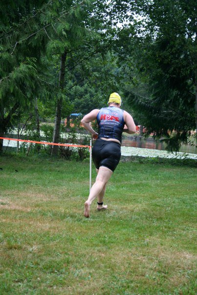 Comments: OMFG! This was hard. Harder than ANY race I've done in my life. My bike is ok (Cannondale) but it has NO SHOCKS! I felt every rock, stump and branch on the ground. I tried to move fast but whenever I hit a tree stump or a rock my bike would freeze. I hit the handlebars countless numbers of times and almost went over on several occasions. The 1st loop too was a pain because I had to keep stopping to let everyone pass me. I must have stood there a good 10 minutes at one point. I was getting a bit pissesd off as everyone would just ride up my arse and not let me know they were there. WTF? IDIOTS! One guy just ran into the back of me, didn't say a thing either, no sorry, no nothing. Arsehole. 2nd loop I floored it, I knew no one was going to pass me so I did so much better, was almost a good 35 minutes faster! I certainly sped up after word got around there was a bear on part of the trail. At that point I started to sing and whistle and tell the bear that Scottish blood did NOT taste good. There were a few steep parts, both up and down, I walked those. The tyres I had just didn't cut it. I tried but failed, but I tried :) The best part was having to dash through the water carrying my bike! I loved that! There were also some parts of the trail that were just incredible to ride through, I don't think I ever stopped smiling once. What would you do differently?: Bike with shocks. ![]() Transition 2