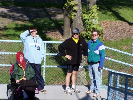 Set up transition area. Discuss use of clip vs clipless. Didn't think that out in a timely manner. Decided to go with the toe clips. Took one lap of the track. Of course the first 50 feet my shoe lace got stuck in the chain. Lucky me no one around to see that. The track was fun to ride. I came to a NASCAR event so it was cool to be on it. There was a300 degree turn exiting the track. Mike did point this out but on the first time through I didn't slow enough and scraped ny knuckles on the divider and tipped it over. Of course that was in front of everybody. Parked teh bike and stretched and walked around.